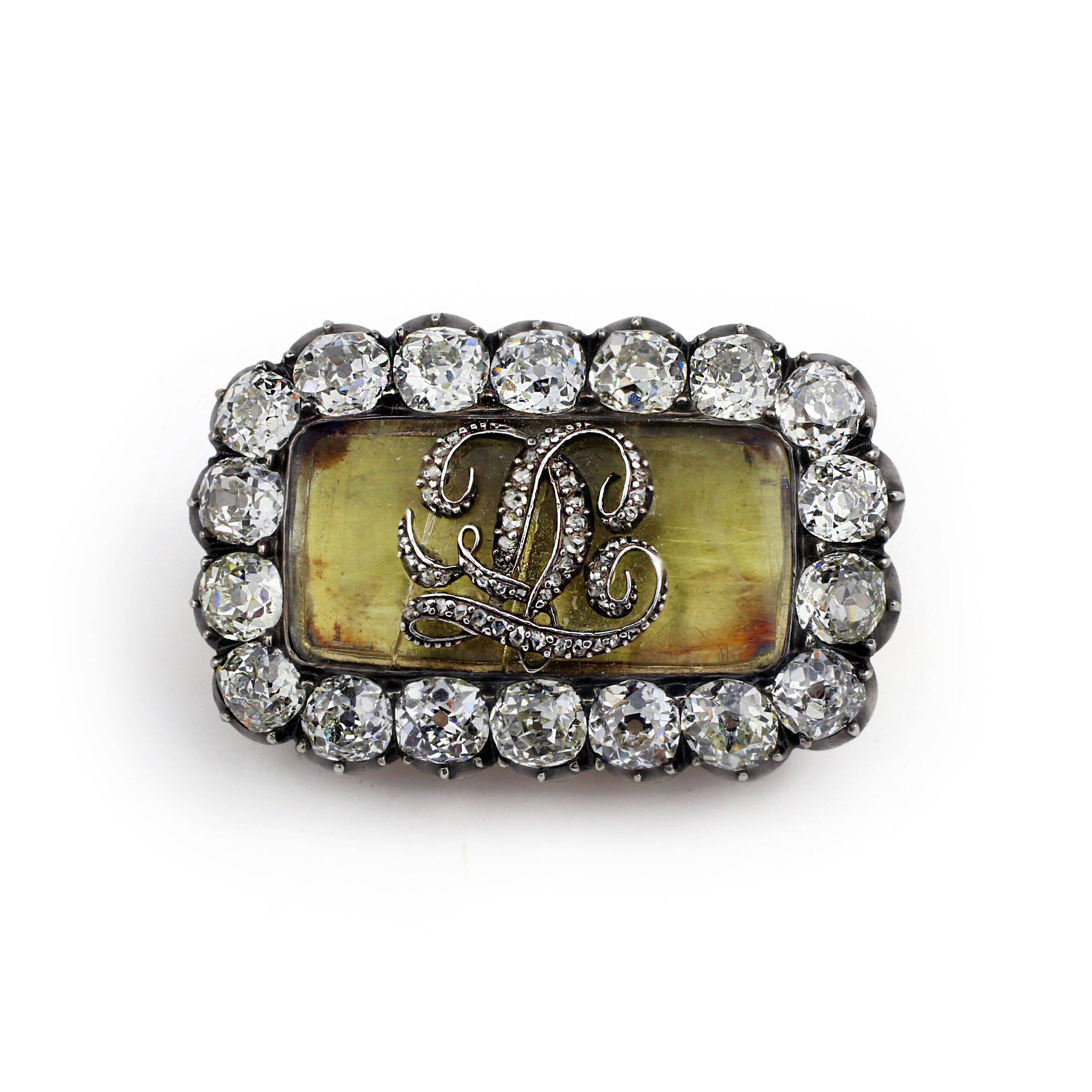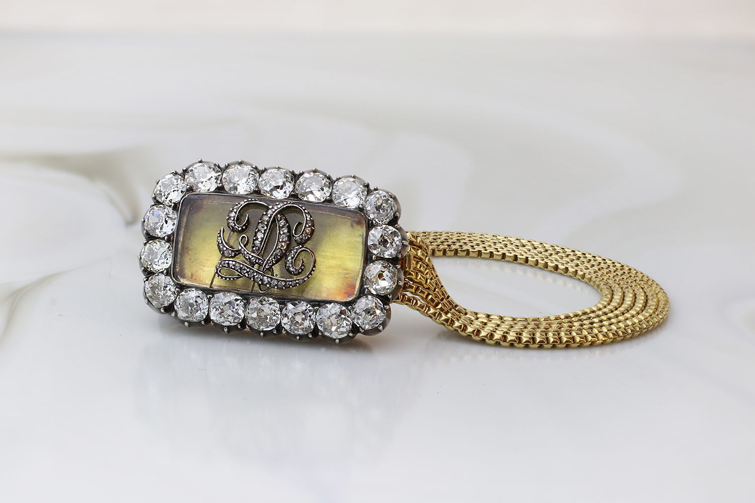 Centering a windowed locket decorated with diamond-set monogram “LC”, in a surround of old-cut diamonds, the reverse with hidden locket compartment with polished gold lid engraved “Comtesse de Vallin, née LaGuiche 1845”, on a bracelet composed of 6 box chains, circa 1845