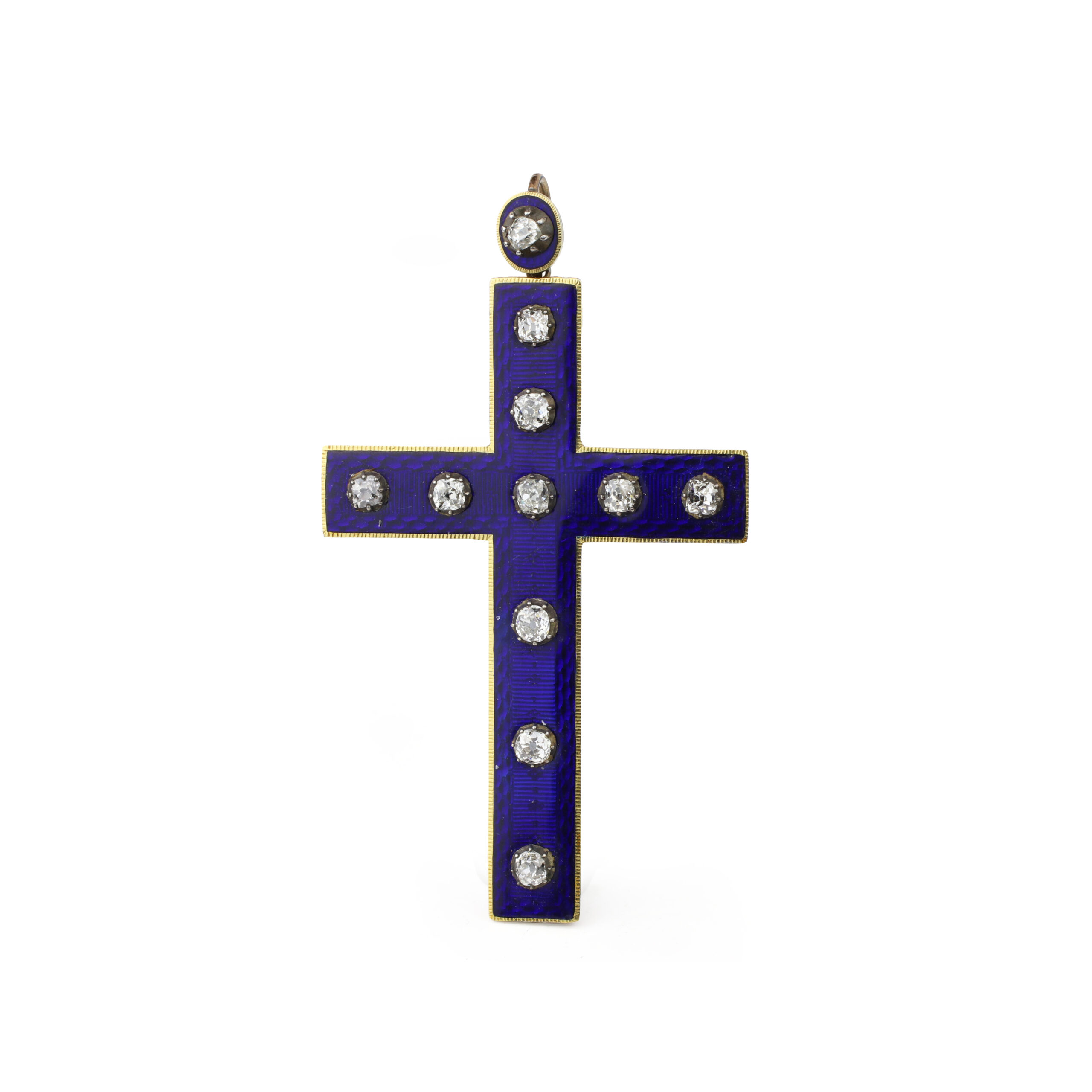 Designed as a cruciform of blue enamel, silver and gold accented with collete set round diamonds, circa 1900