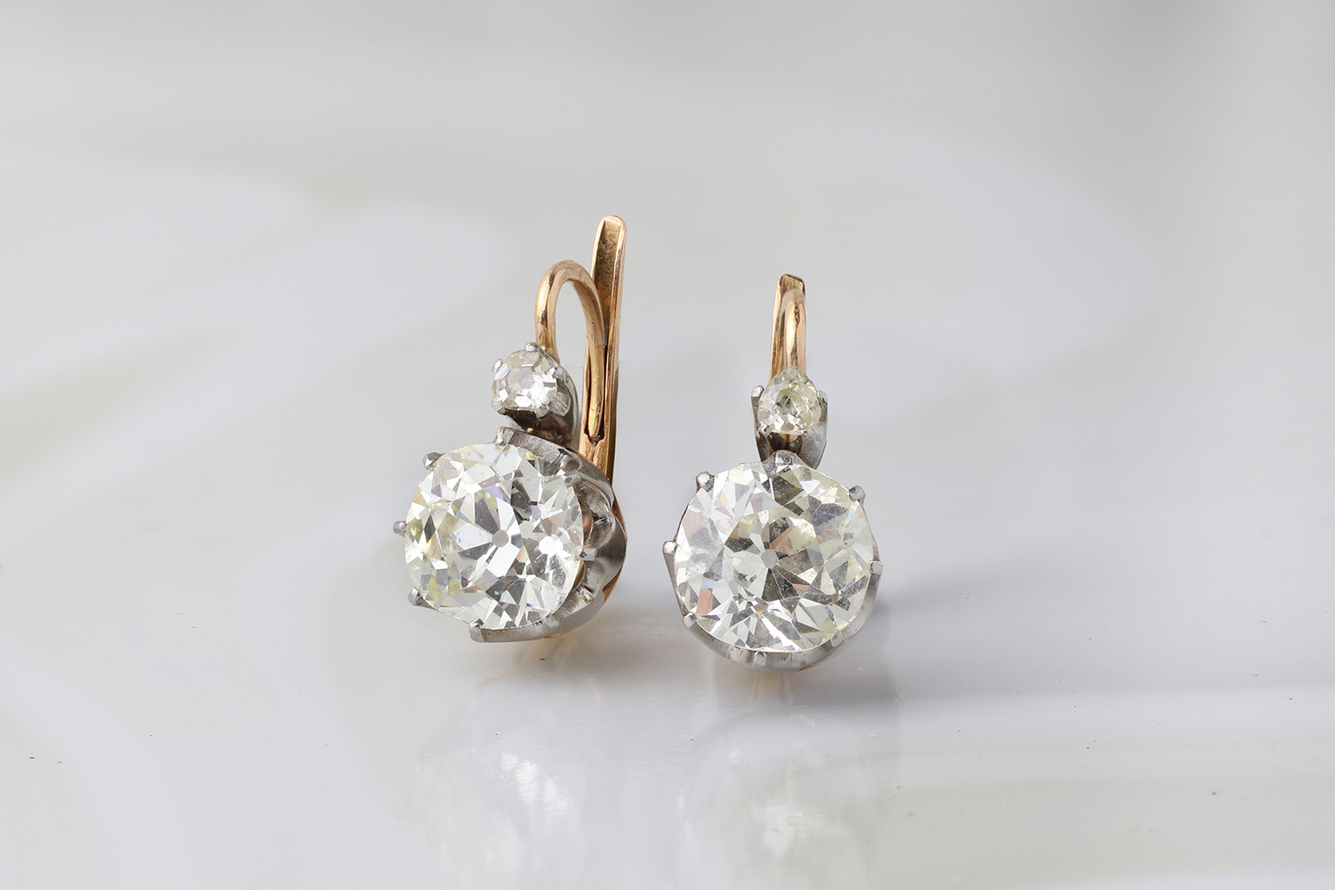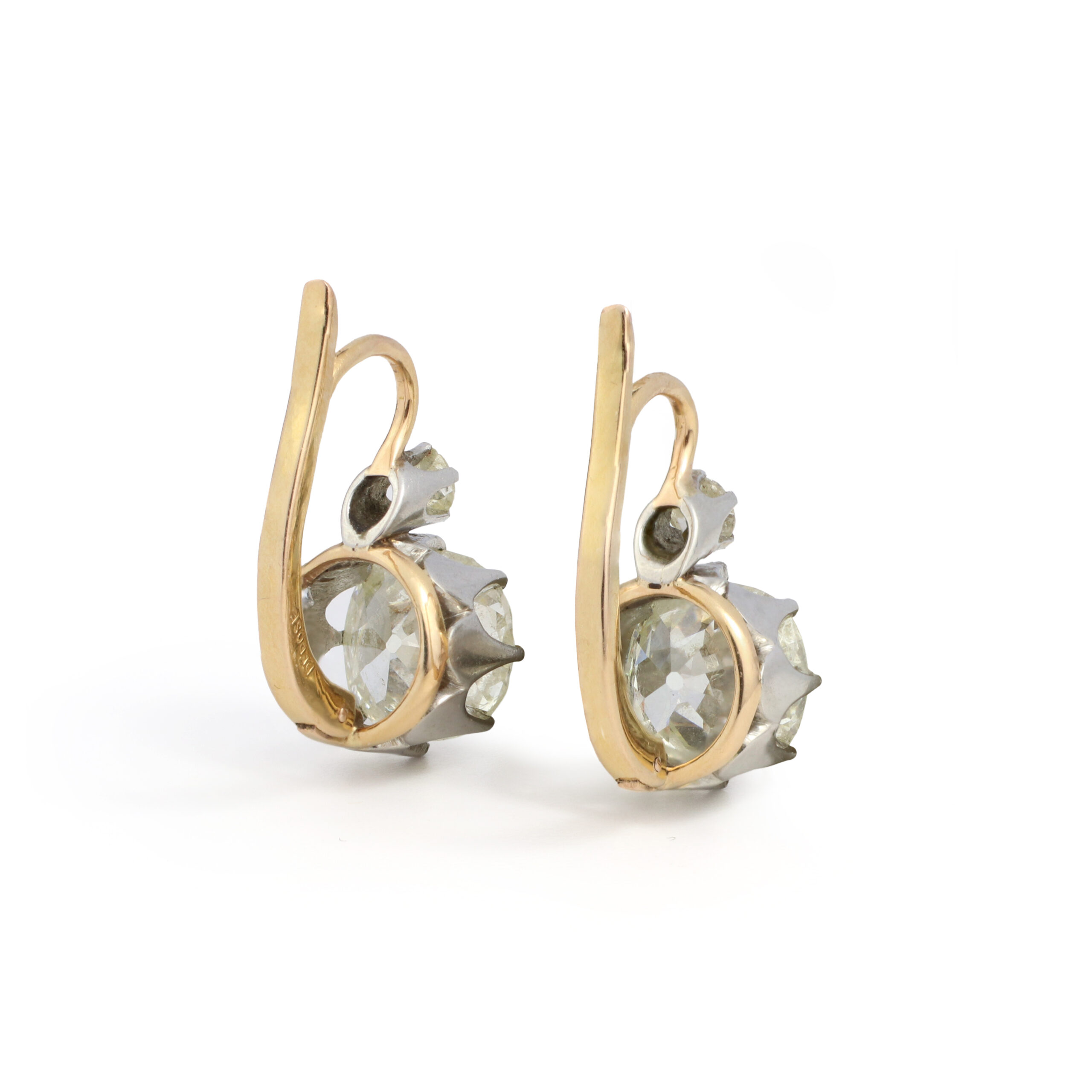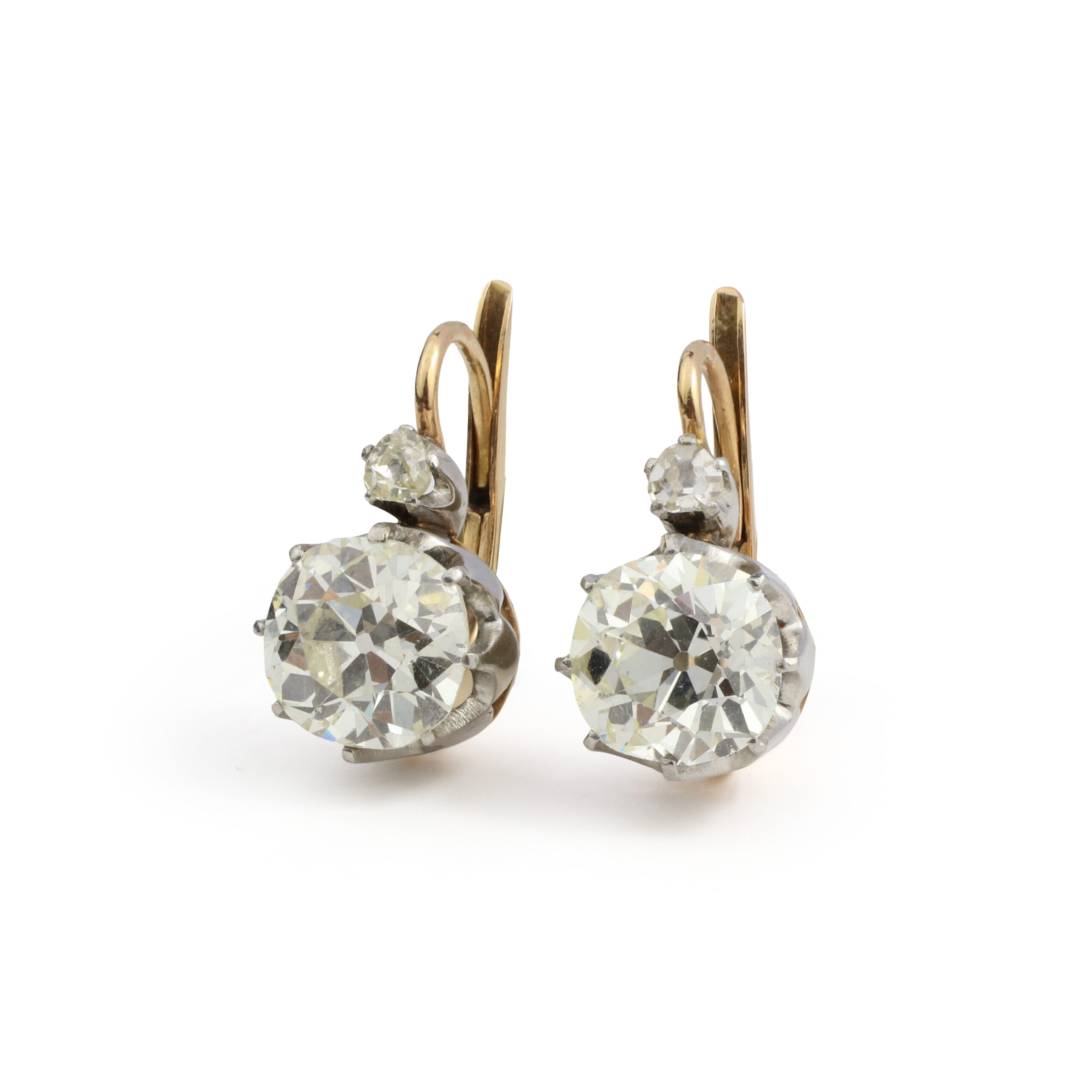 Each ear pendant set with an old mine cut diamond surmounted with a smaller old cut diamond set in platinum and gold, composite