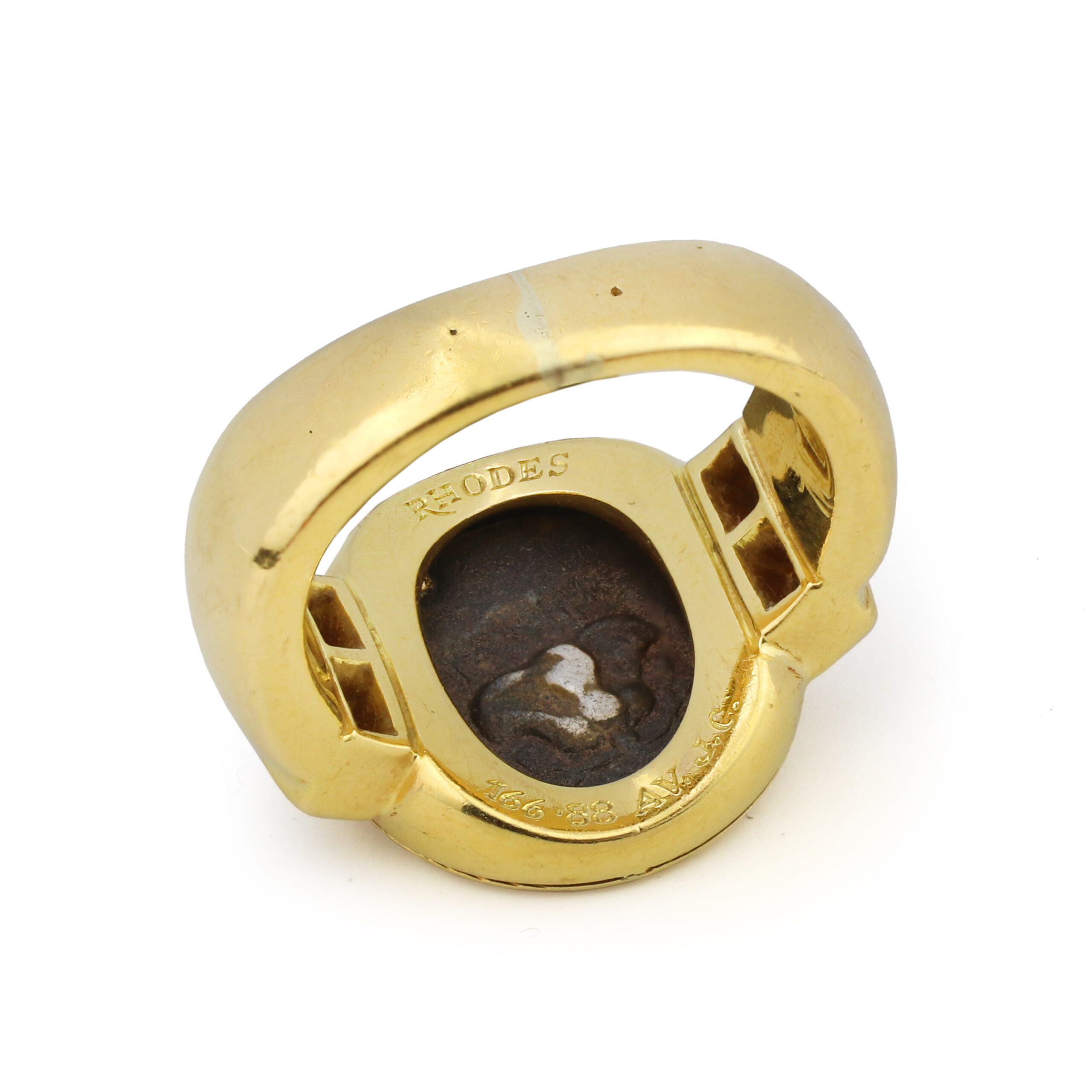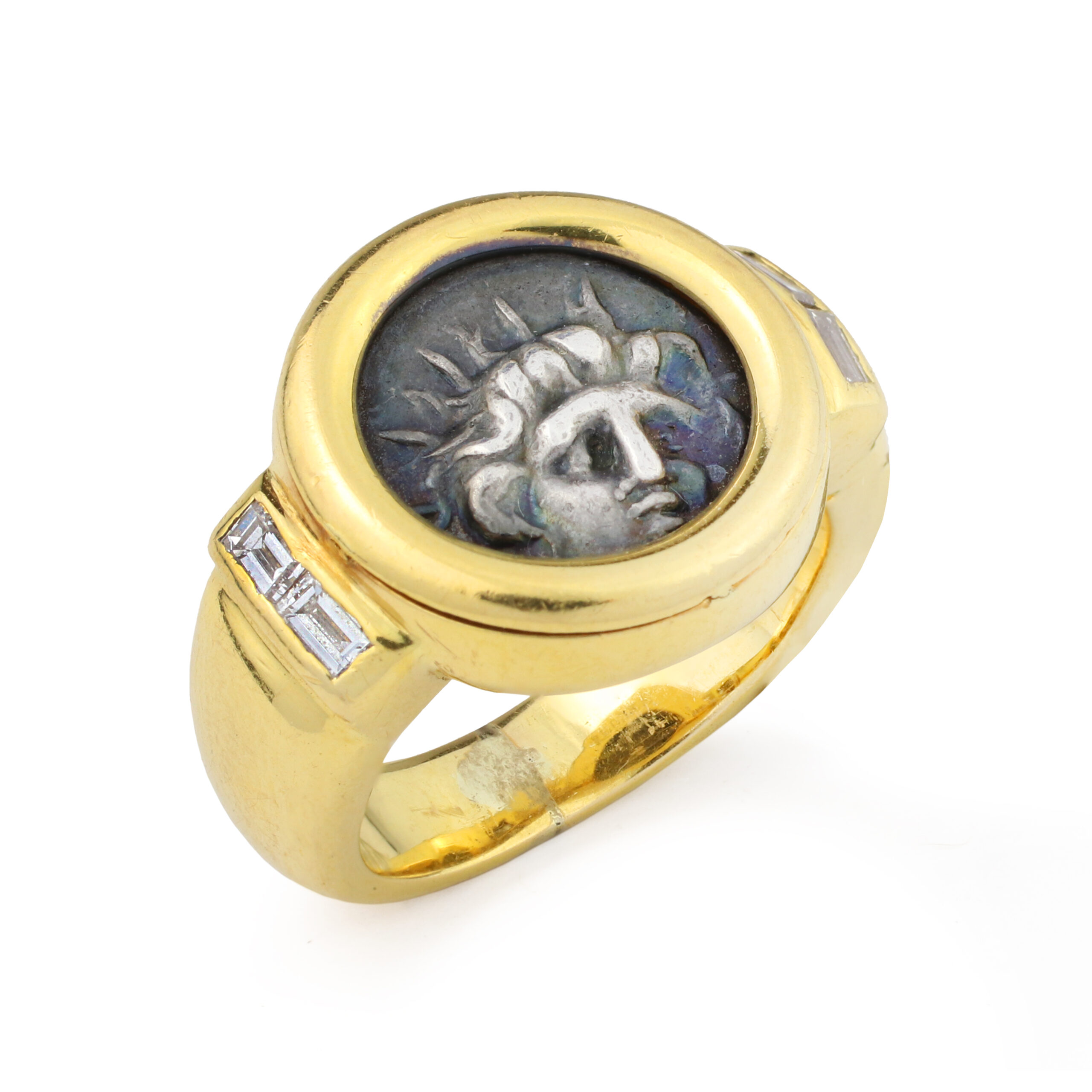 Centering on an ancient coin bezel set with in a baguette cut diamond set sculpted gold mounting, the interior engraved “RHODES 166.88 AV J.C.”, circa 1970