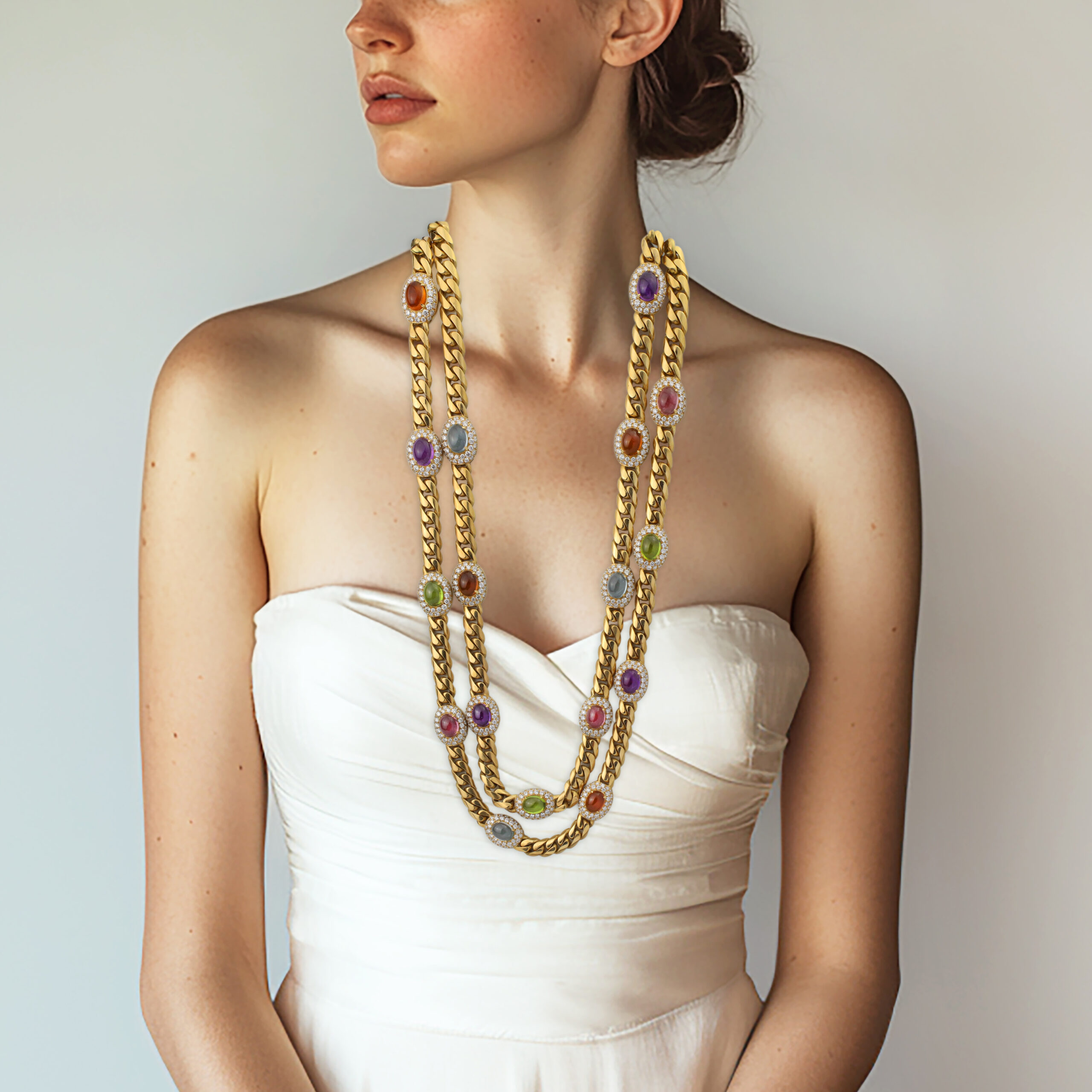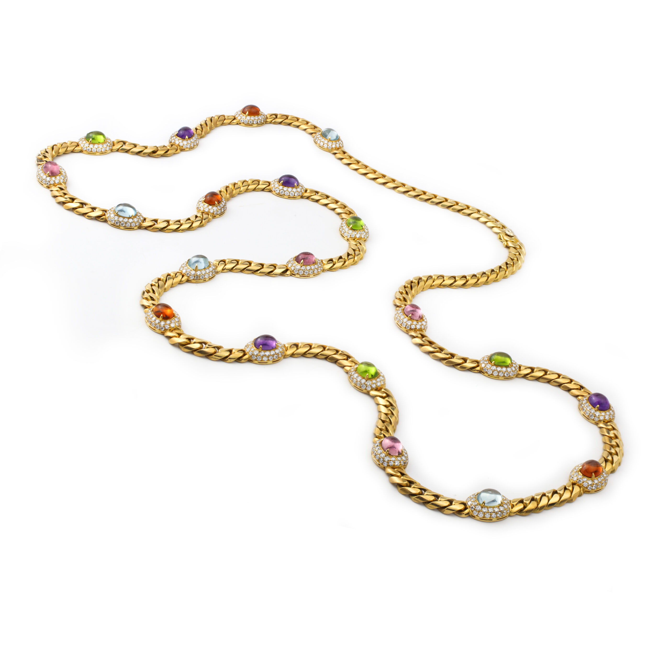 Designed as a long gold curb link necklace with 20 stations of oval shaped cabochon amethyst, aquamarine, citrine, peridot or pink tourmaline, within a round diamond set frame, circa 1980