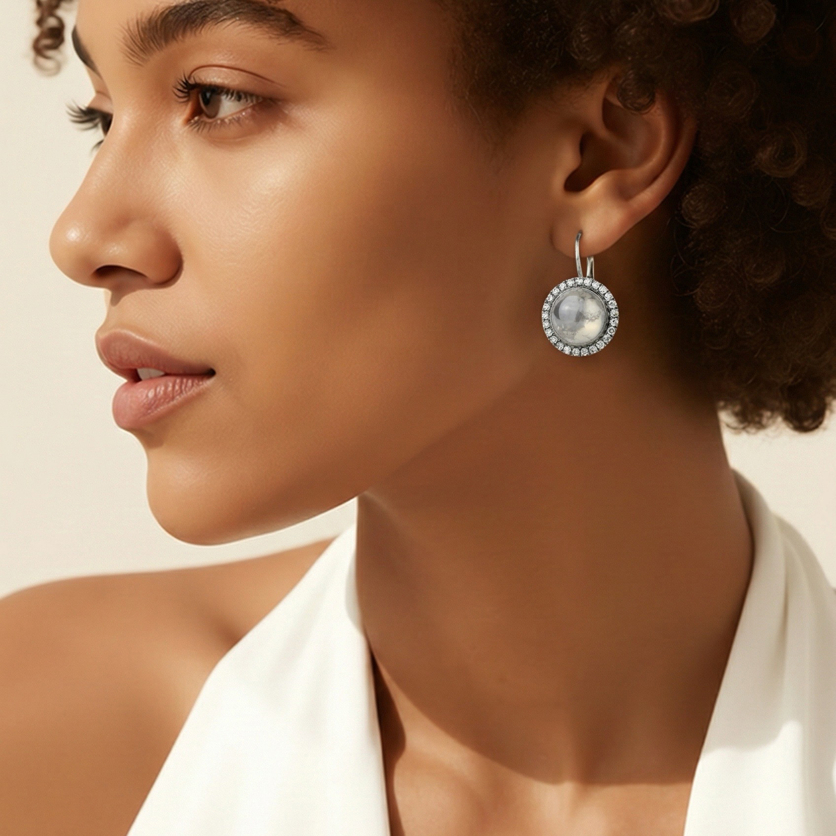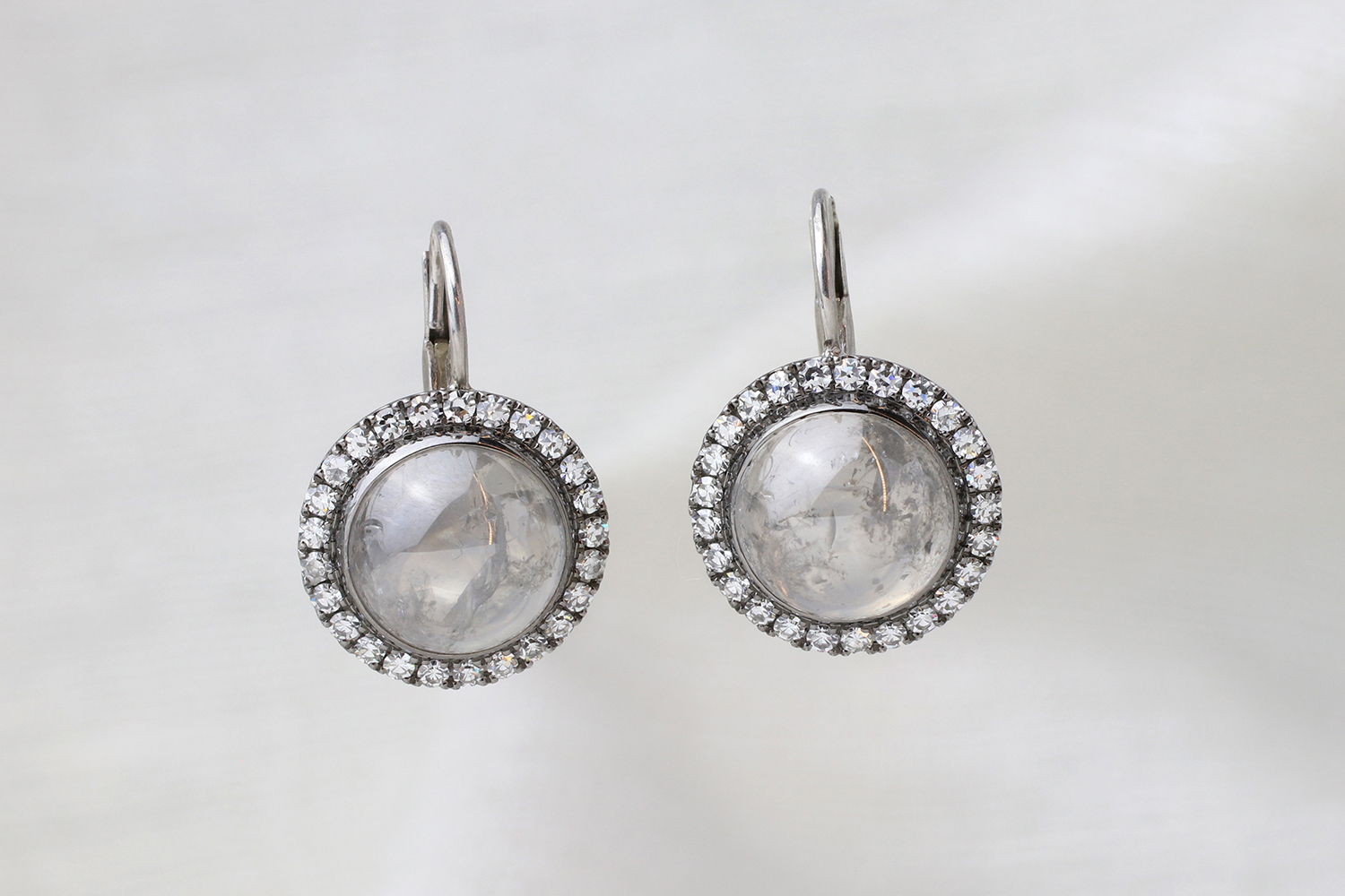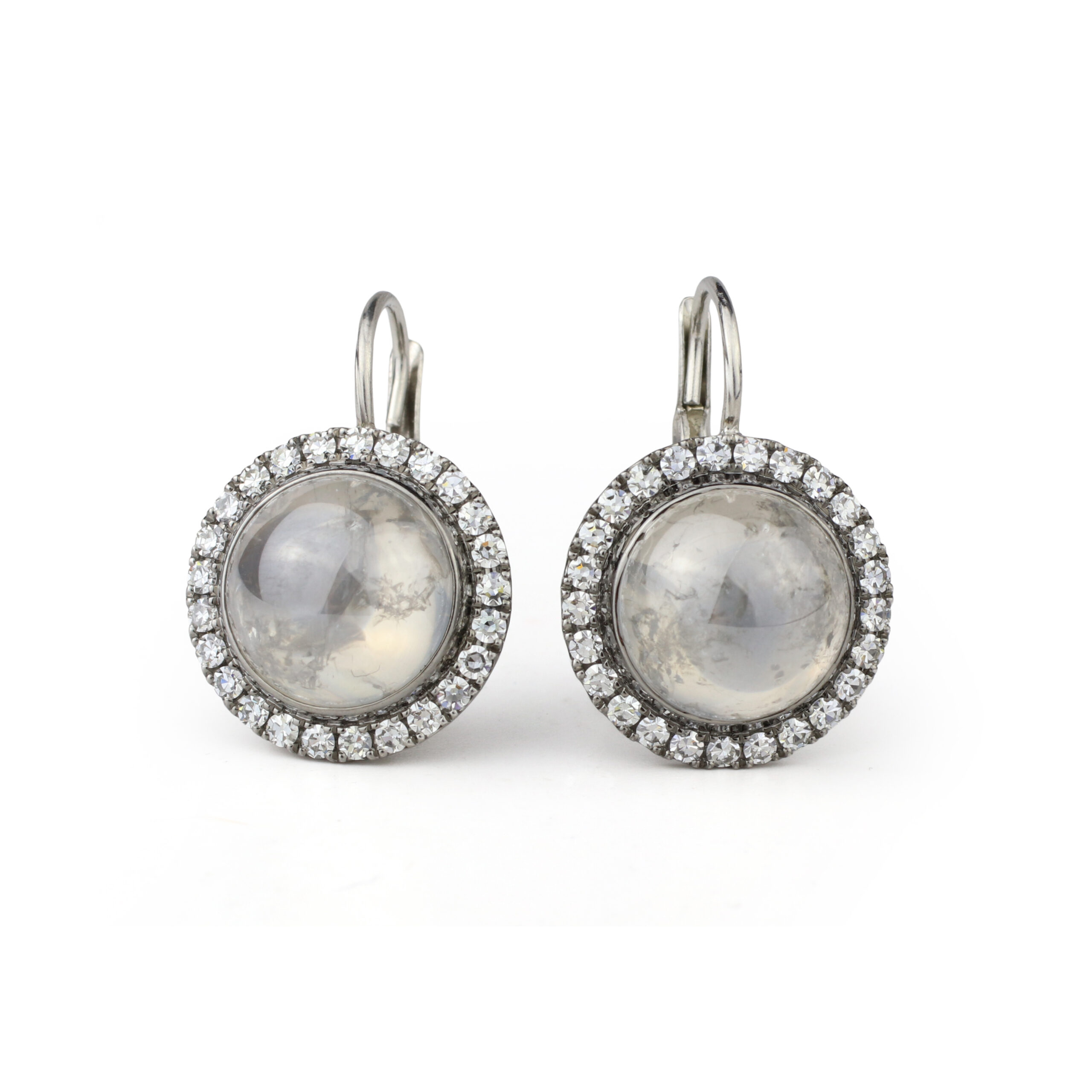 Cabochon White Diamond, Single Cut Diamond and Platinum Ear Pendants