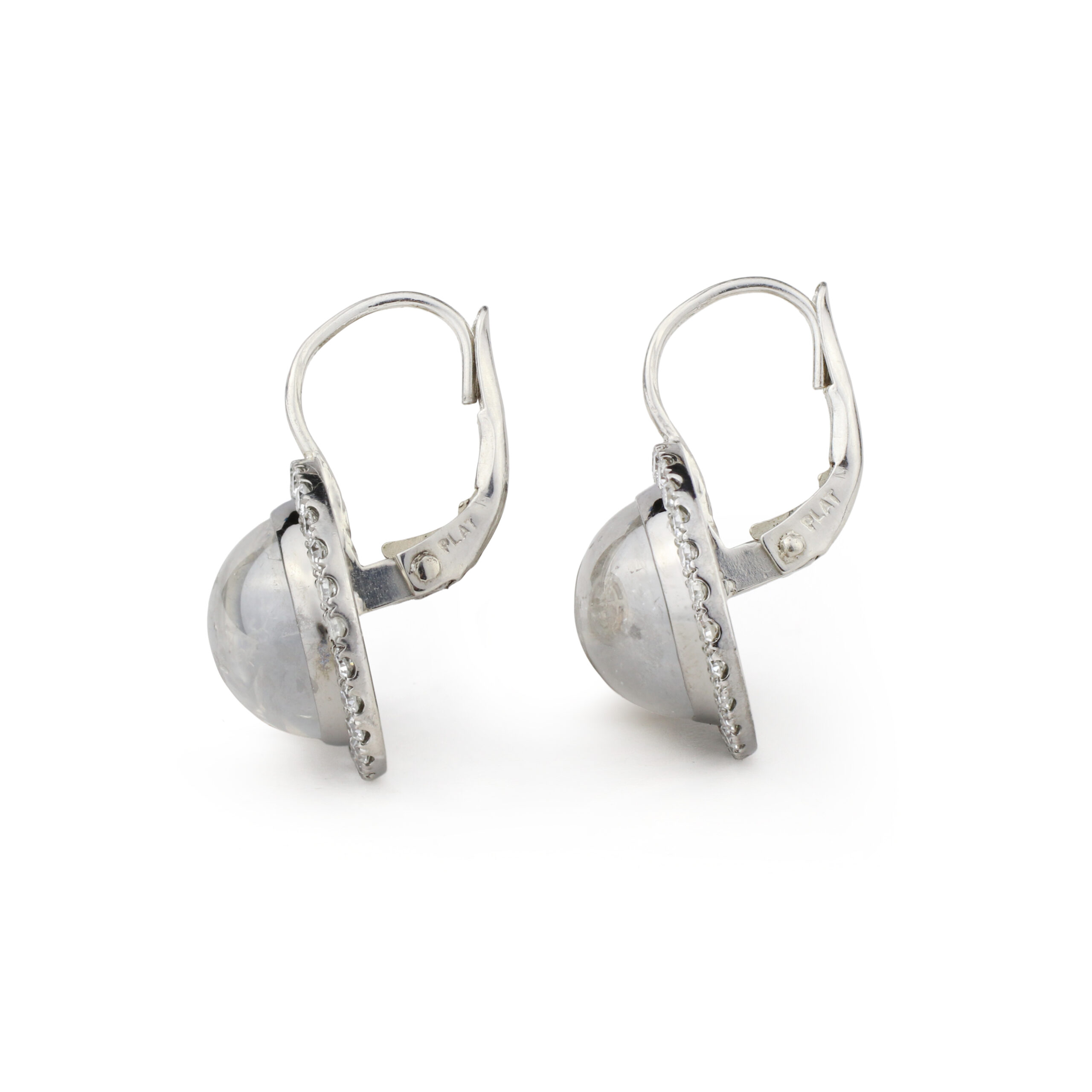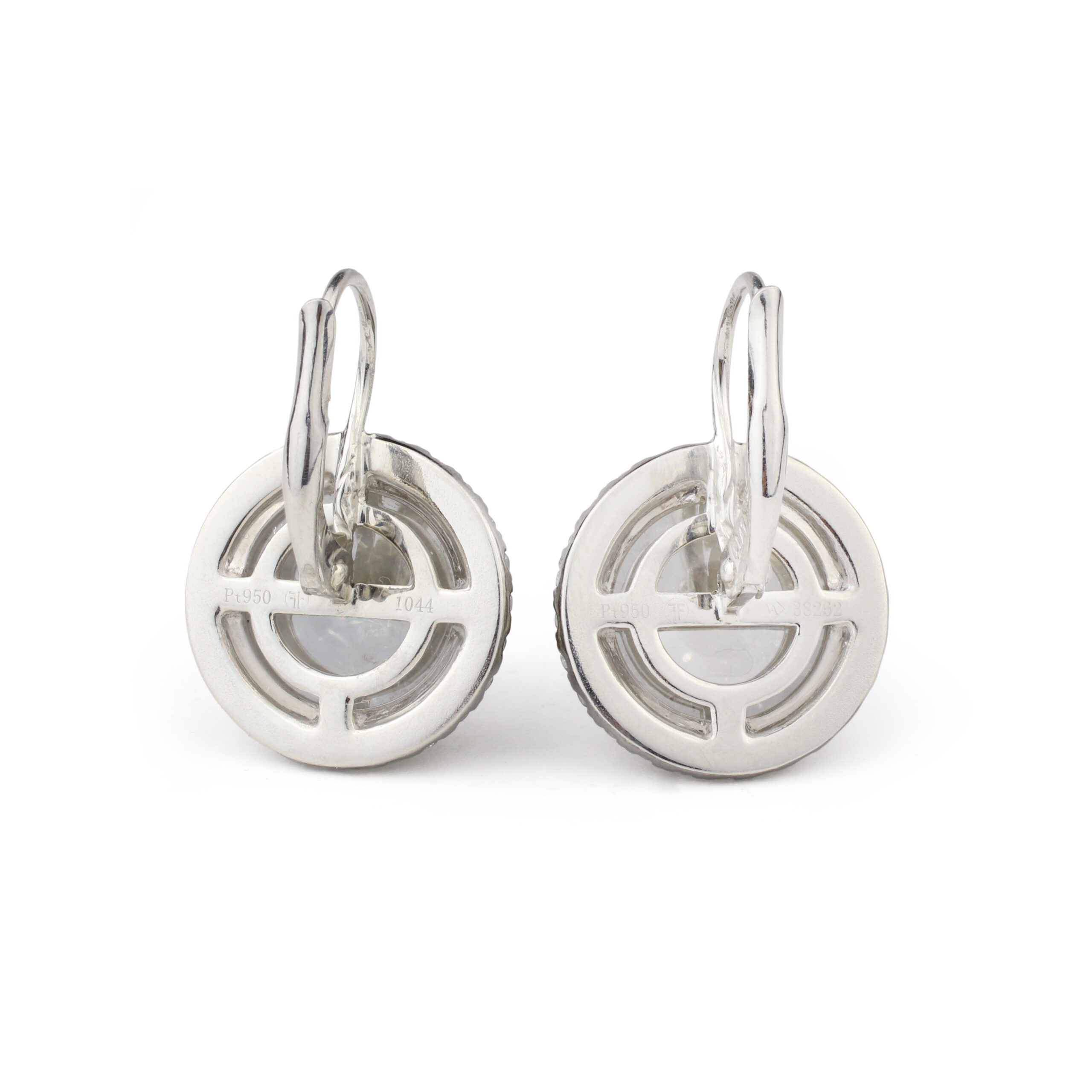 Each ear pendant centering on a round cabochon white diamond with a frame of round colorless diamonds mounted in platinum, contemporary