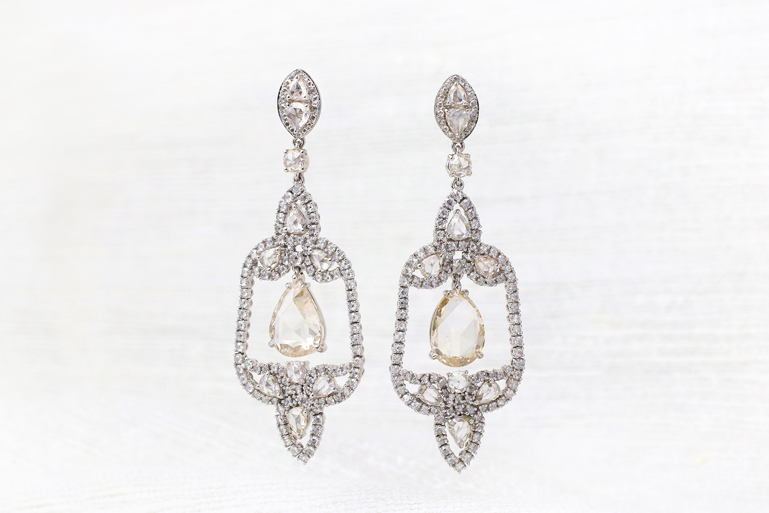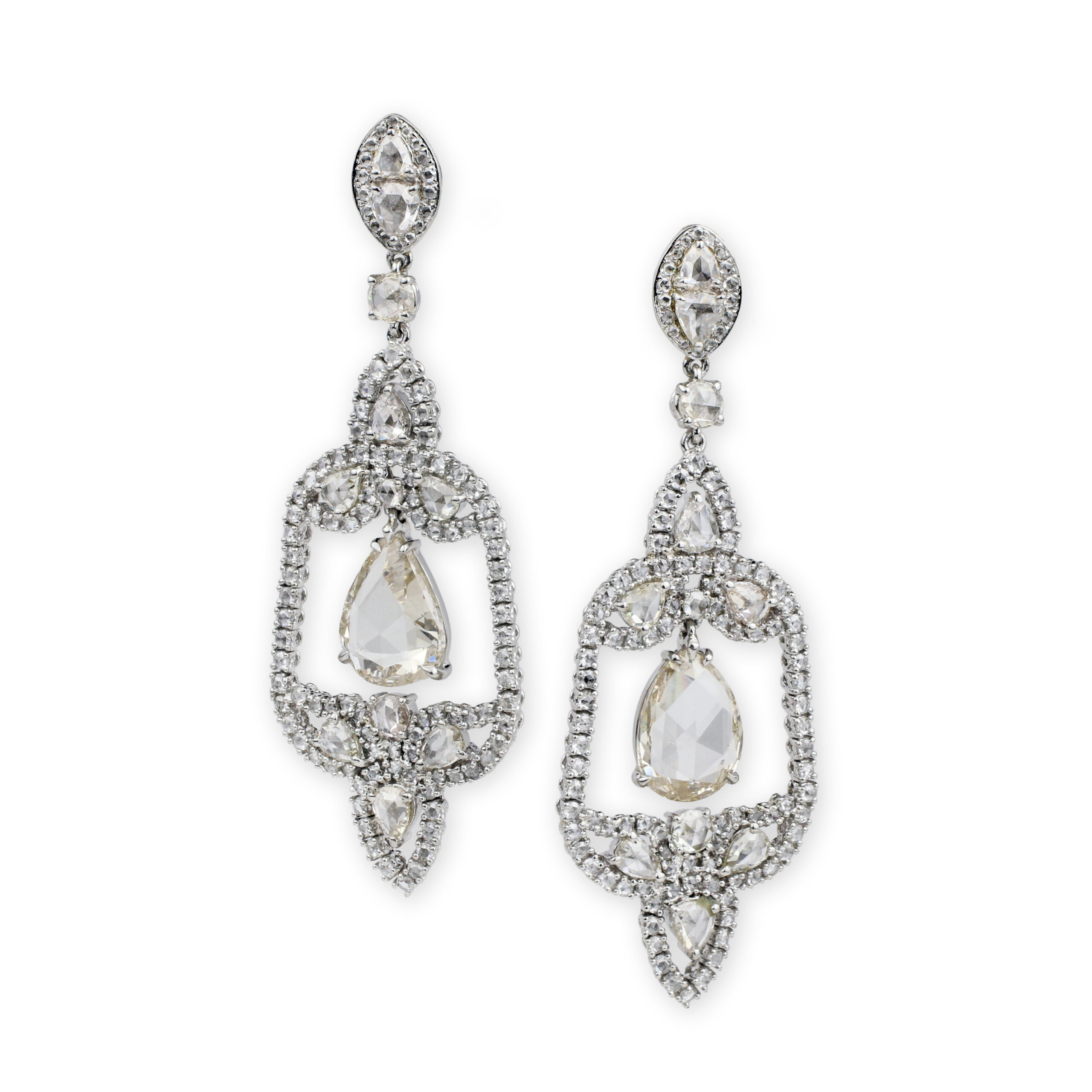 Set though out with rose cut diamonds, each top of marquise shape suspending an openwork bell shaped drop with trefoil design terminals accented with a pear-shaped rose-cut diamond drop center, mounted in platinum and white gold circa 2010
