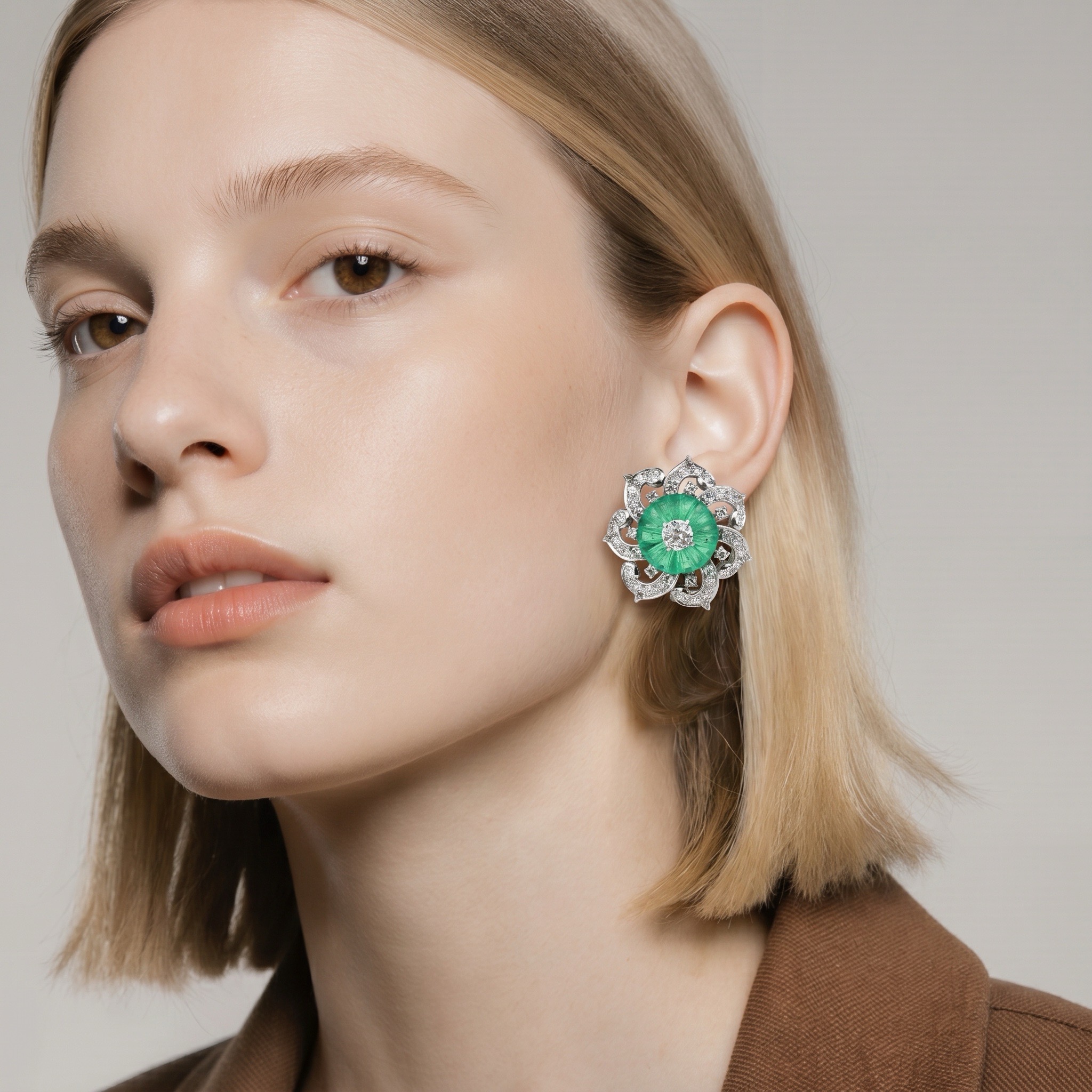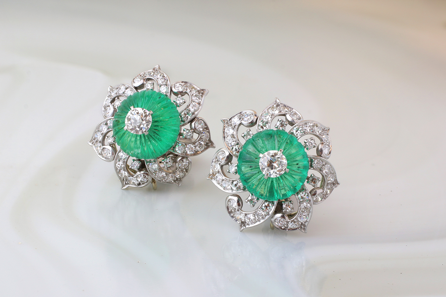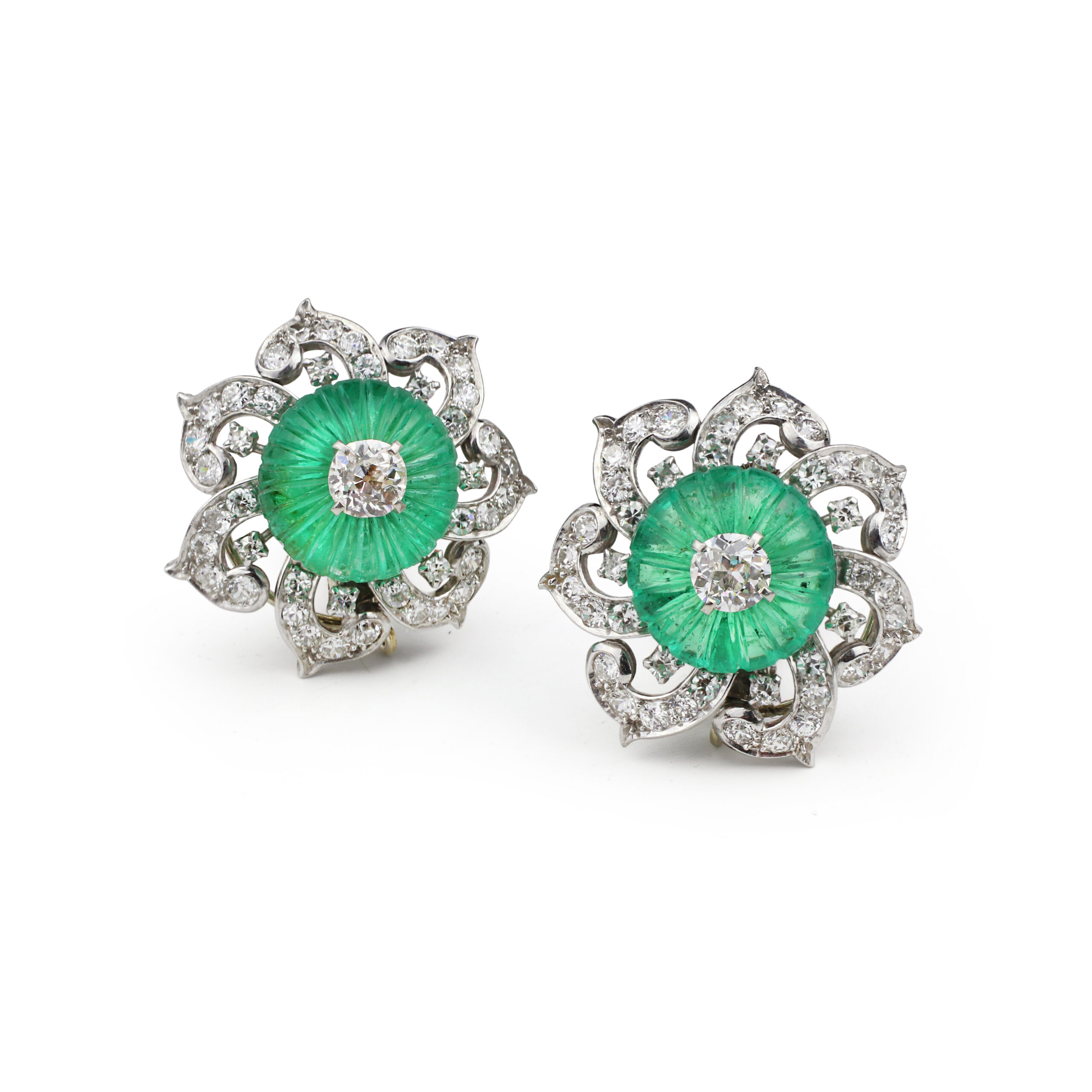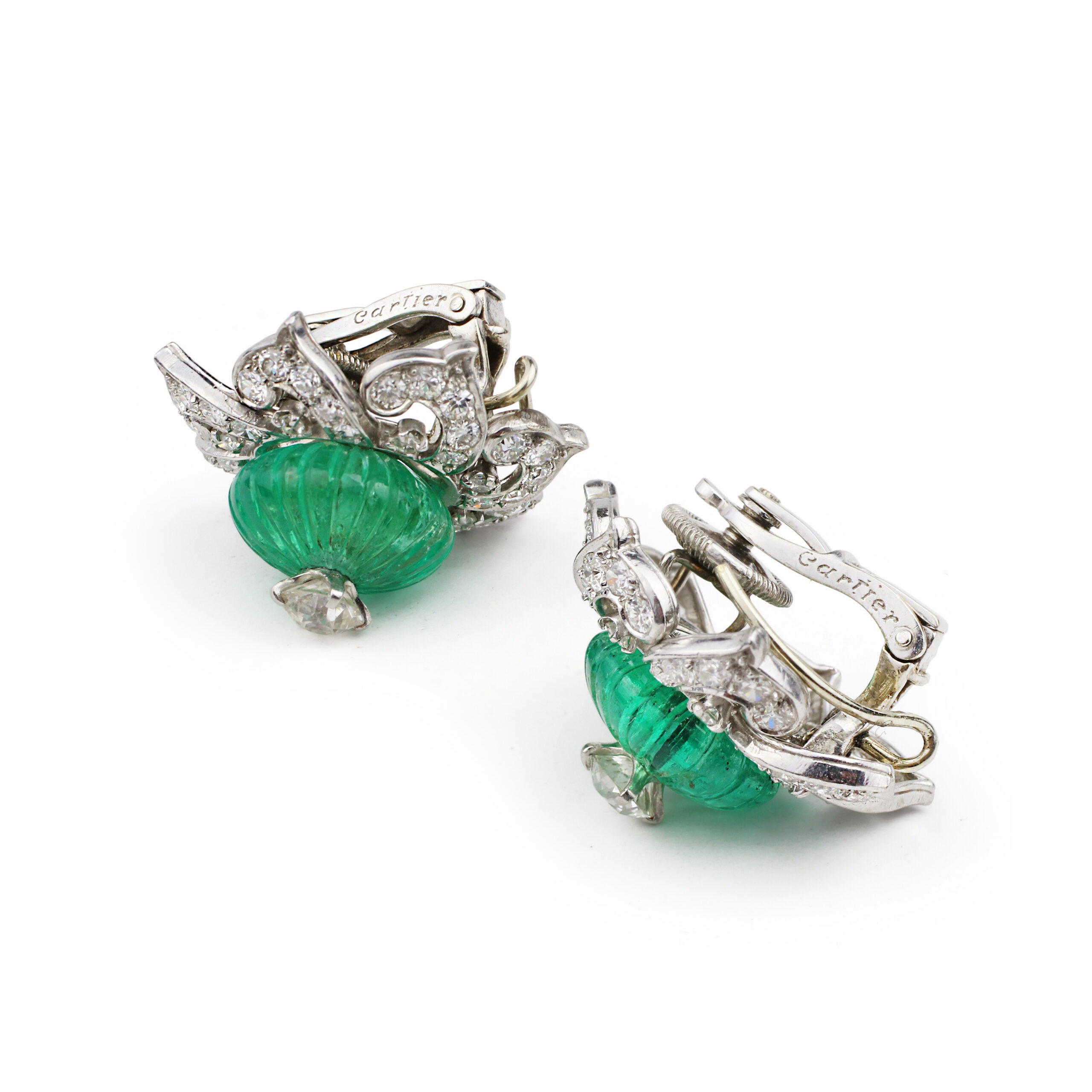 Cartier Mid Century Carved Emerald and Diamond Ear Clips