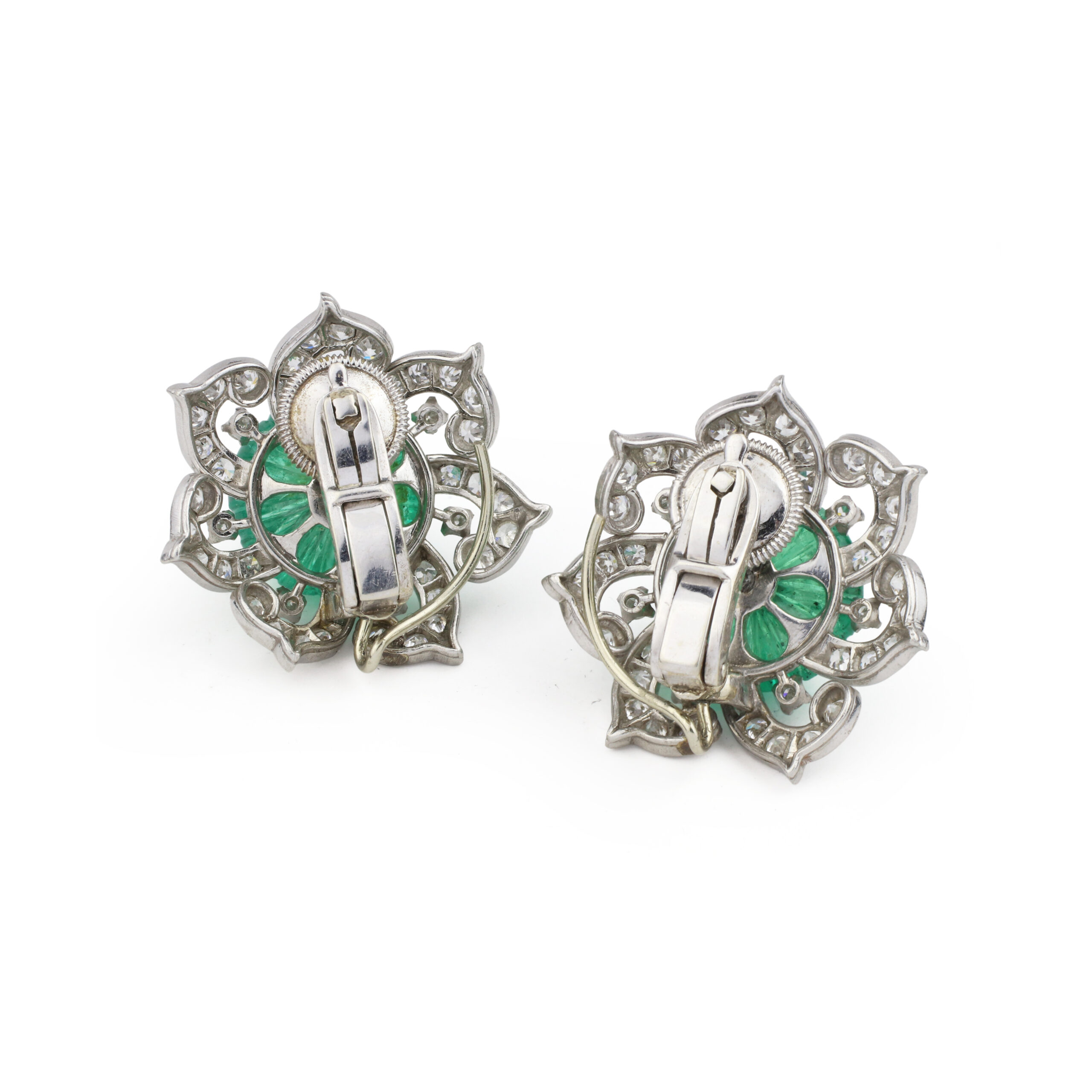 Each clip with a floral motif centering on an old round cut diamond prong set in a carved emerald bead within a border of diamond set openwork petals, mounted in platinum and white gold, circa 1950