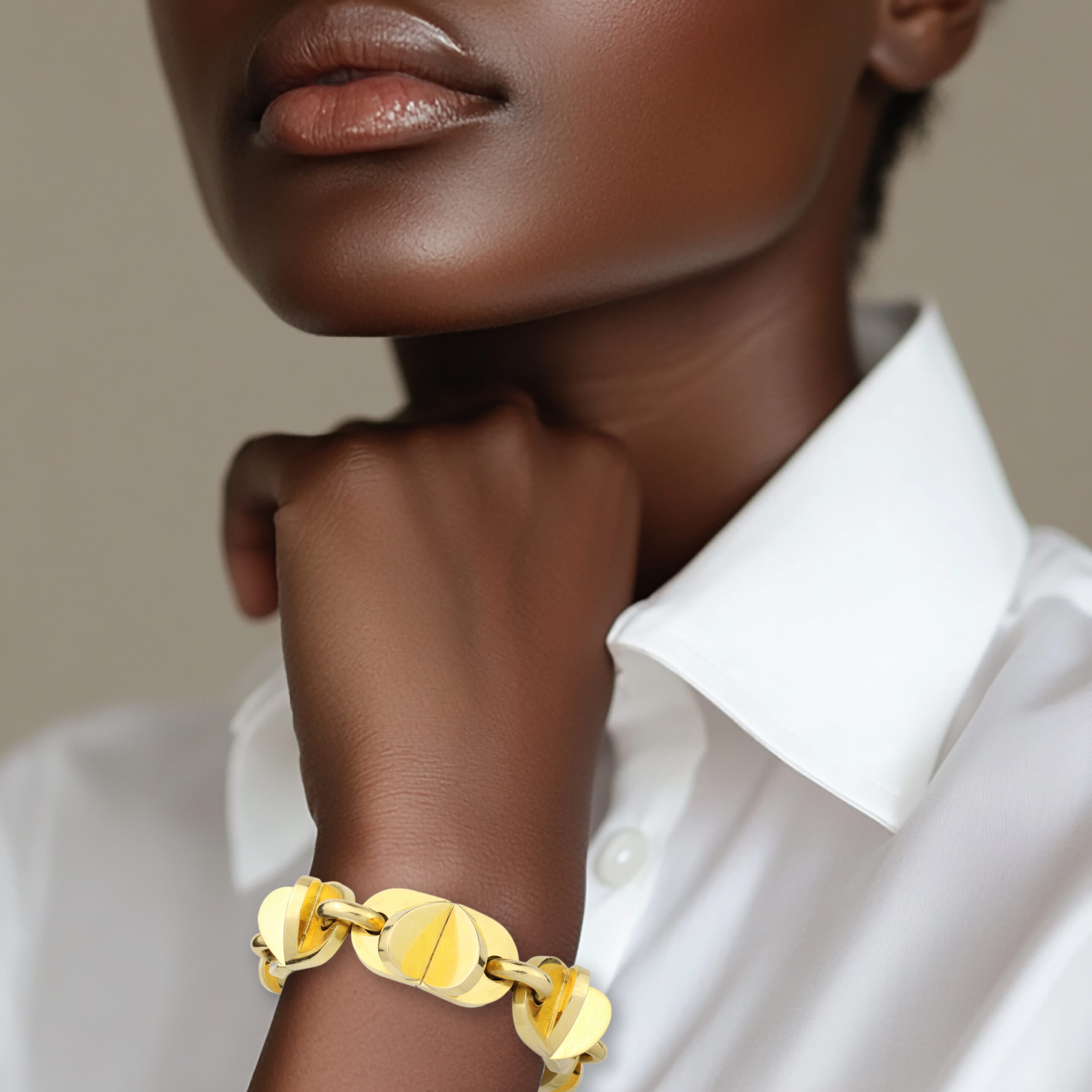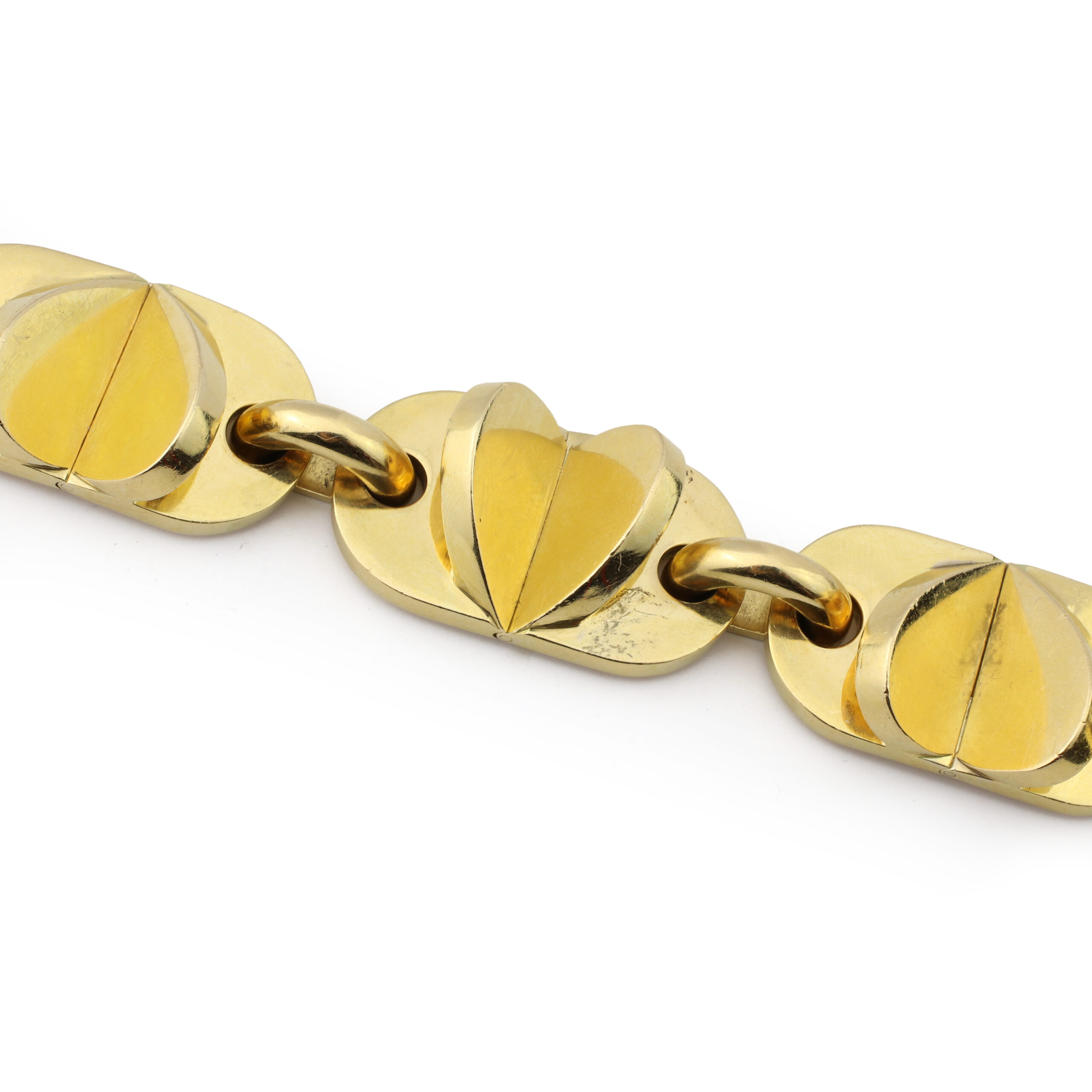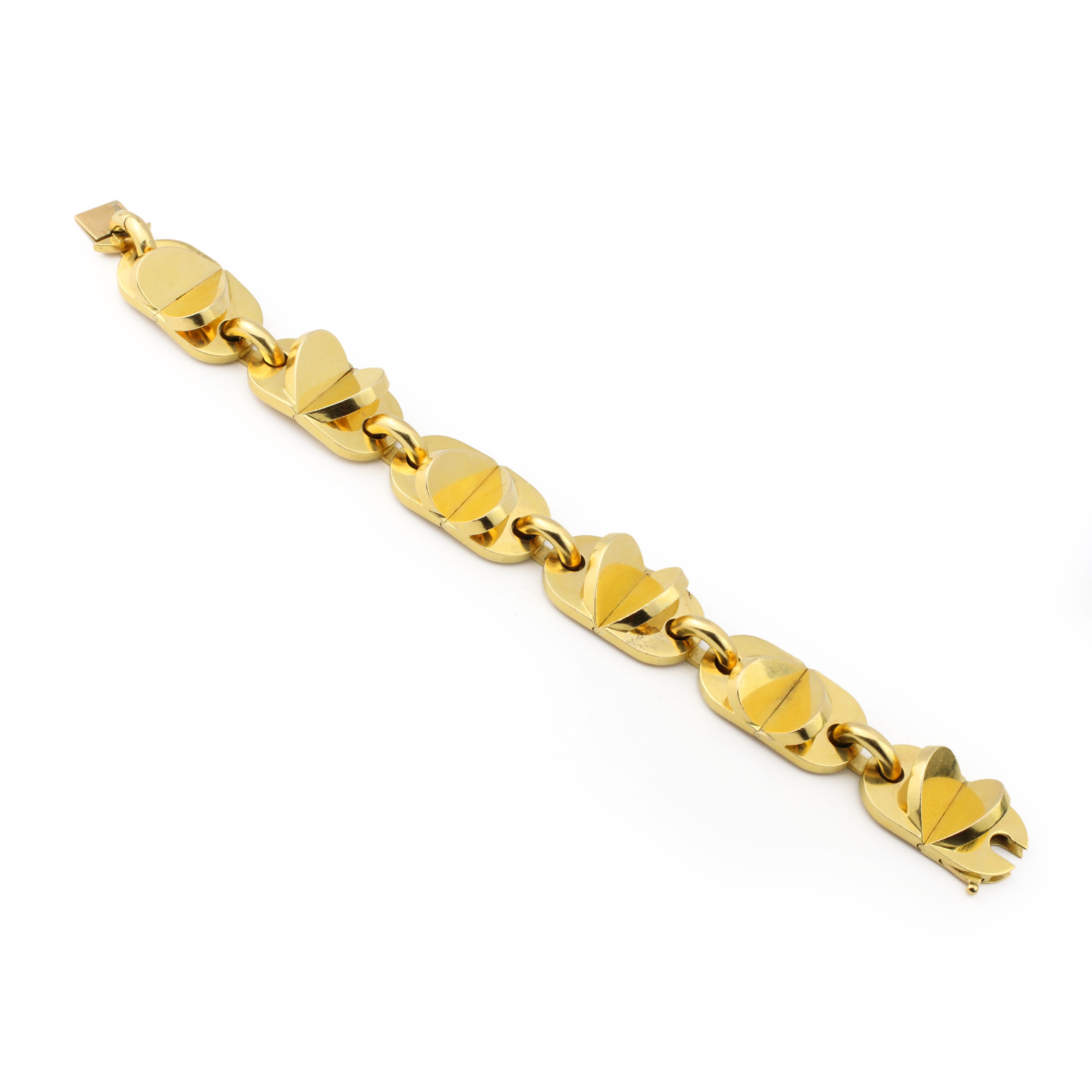Designed as a bracelet of six 3D oval shaped hinged links each with a reflective heart motif, circa 1960