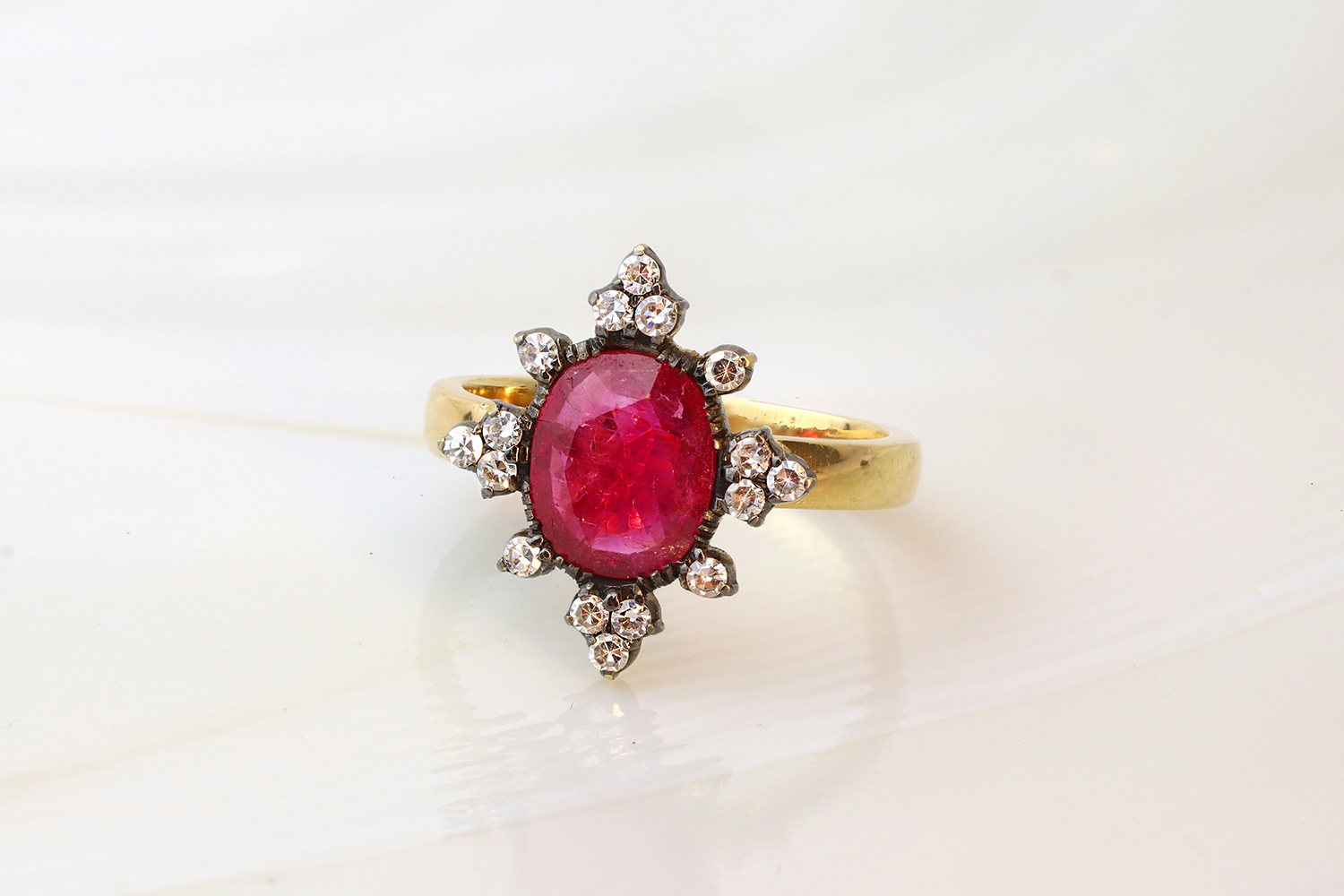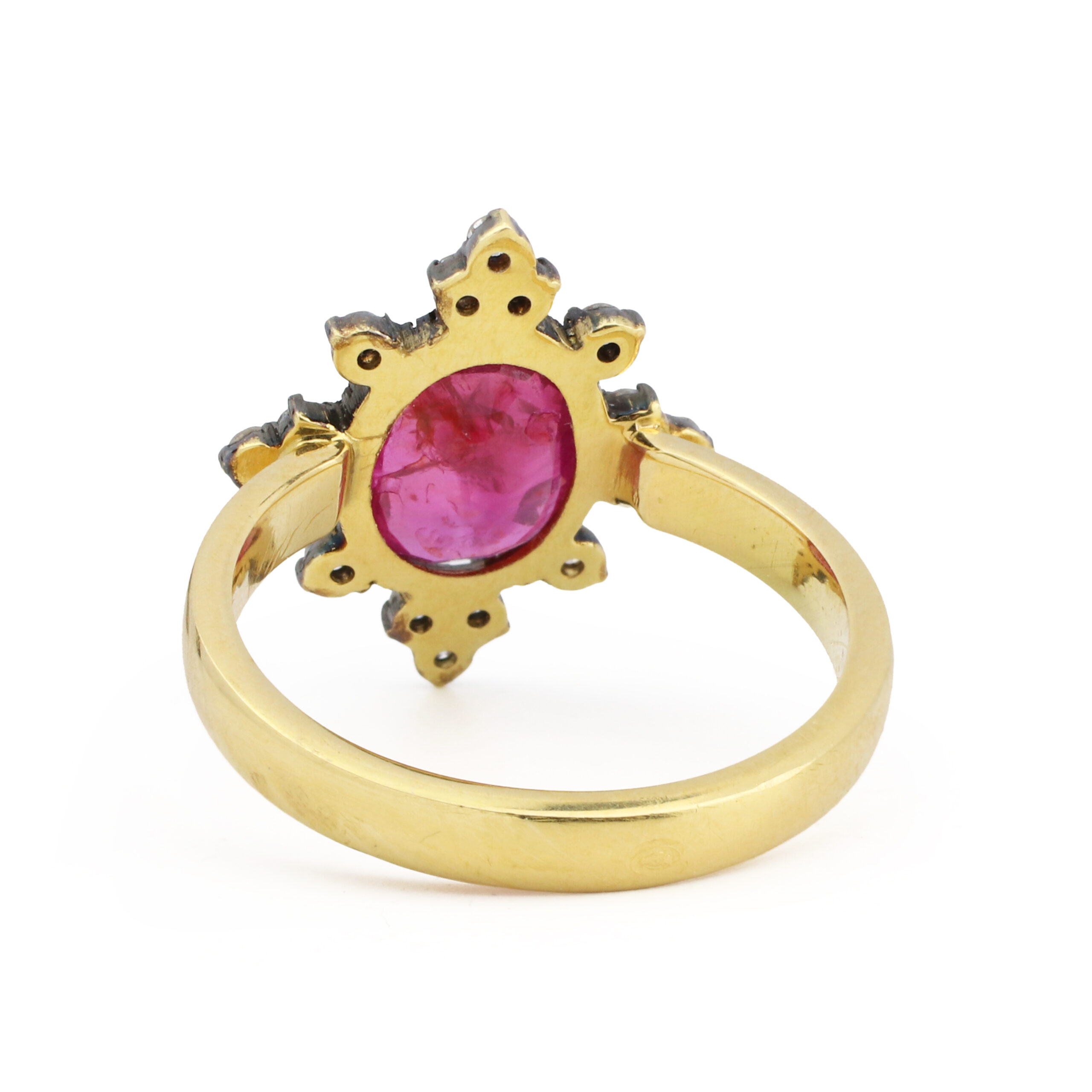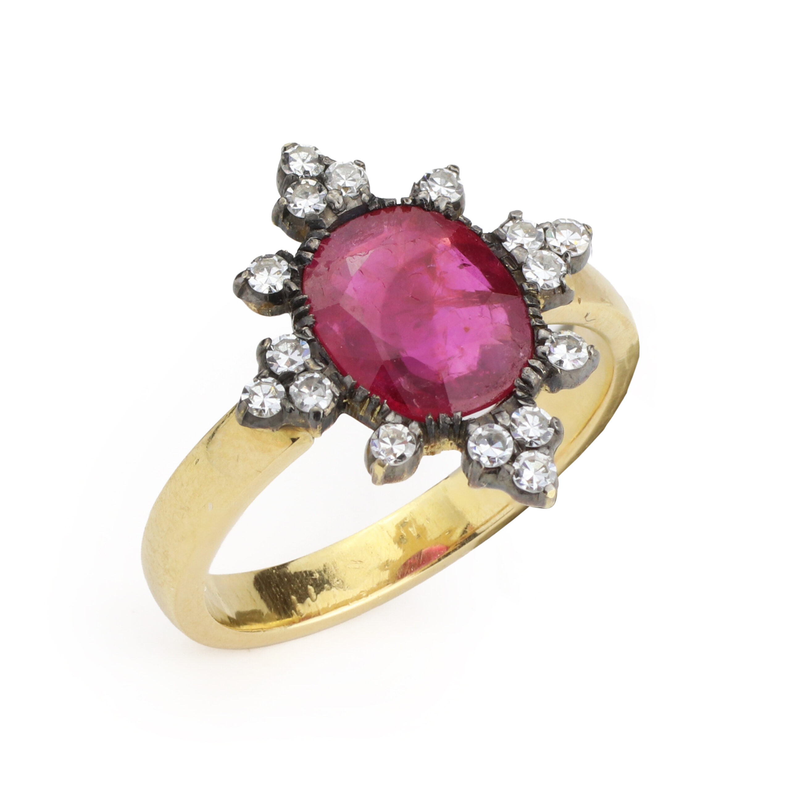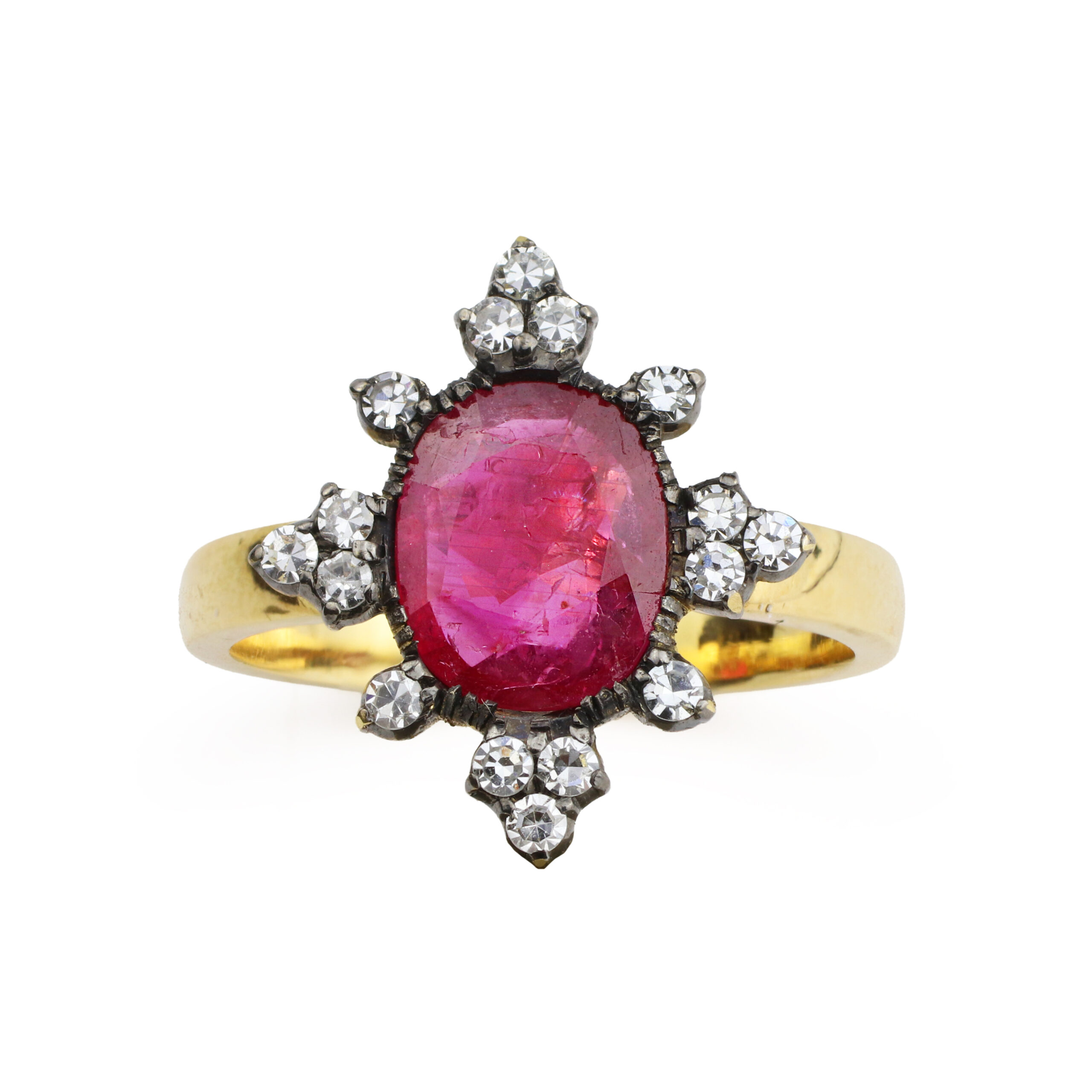 Centering on a cushion cut ruby surrounded by single cut diamonds mounted in silver and gold, to a plain gold band, composite