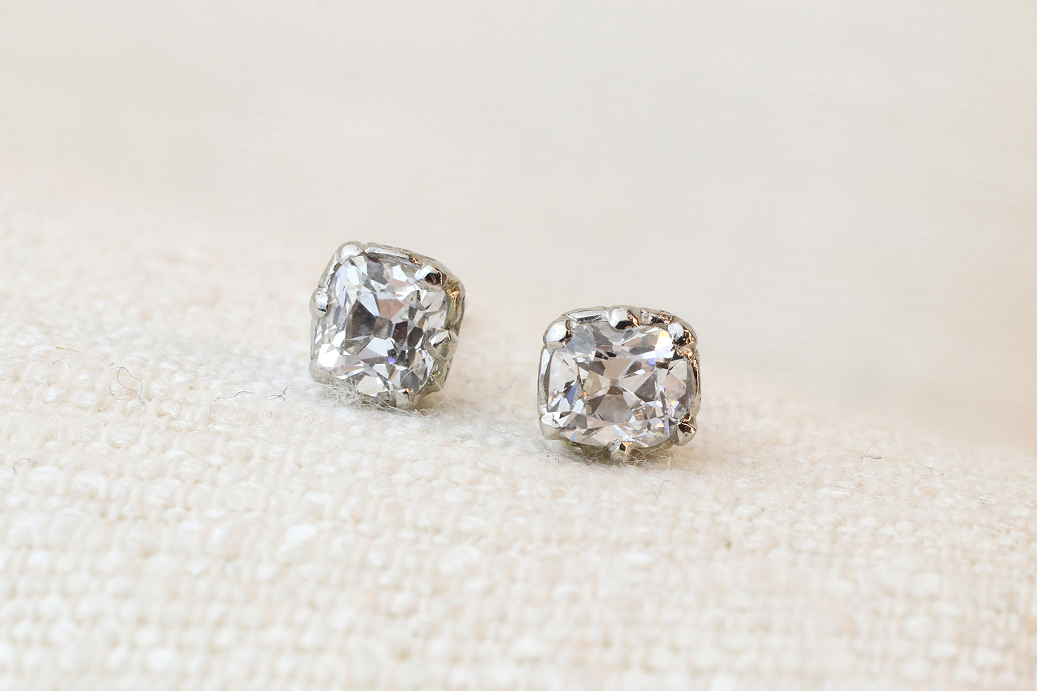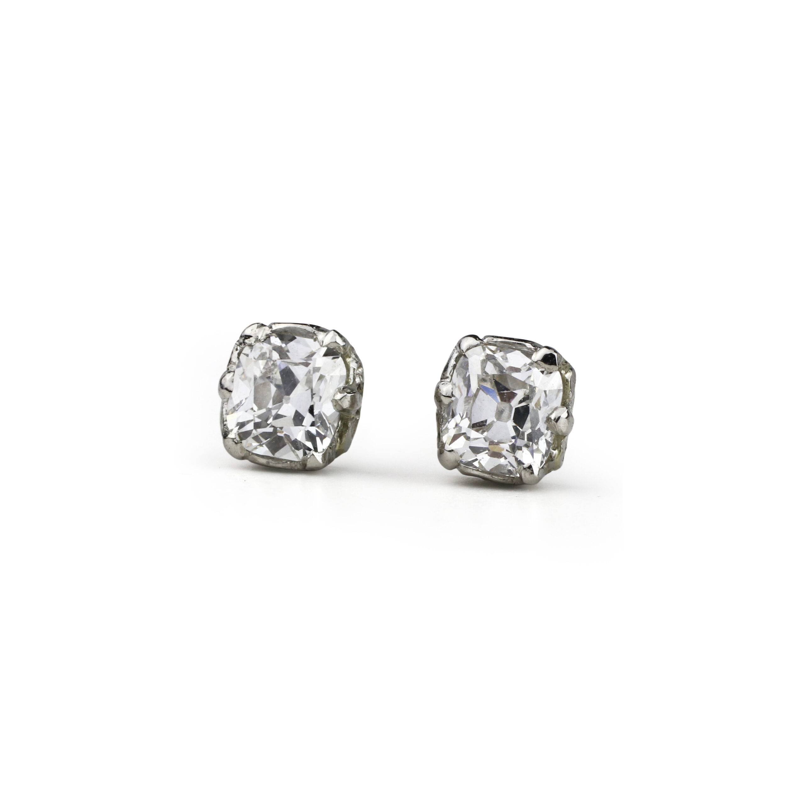 Each stud centering on a cushion cut diamond prong set in a scrolled platinum mounting, composite head of earrings circa 1900 posts of later addition