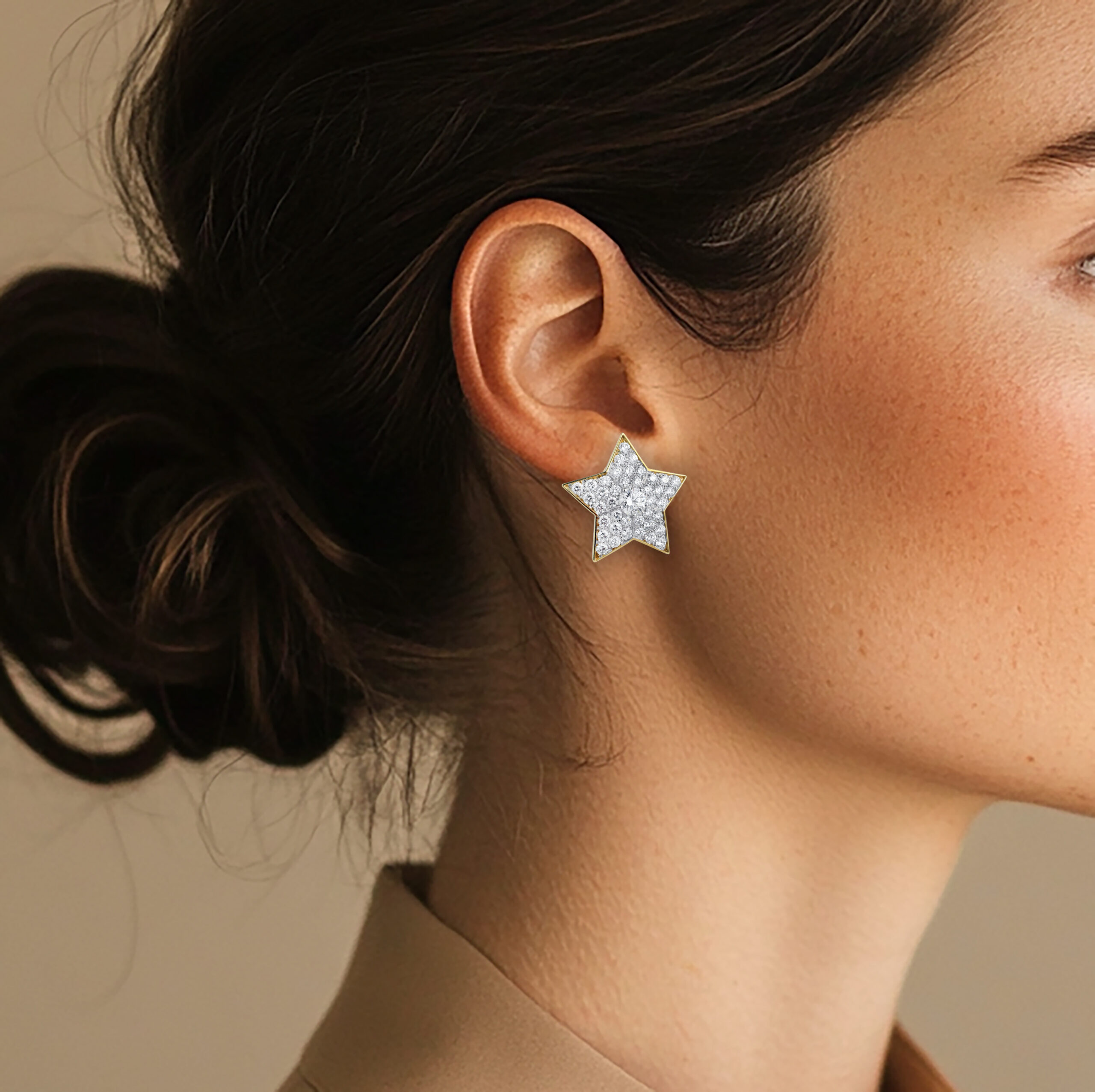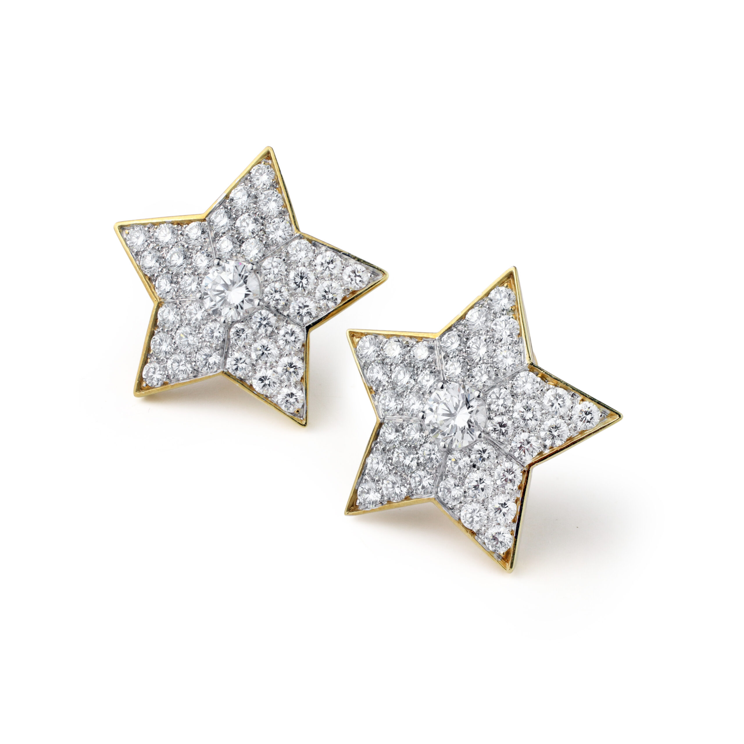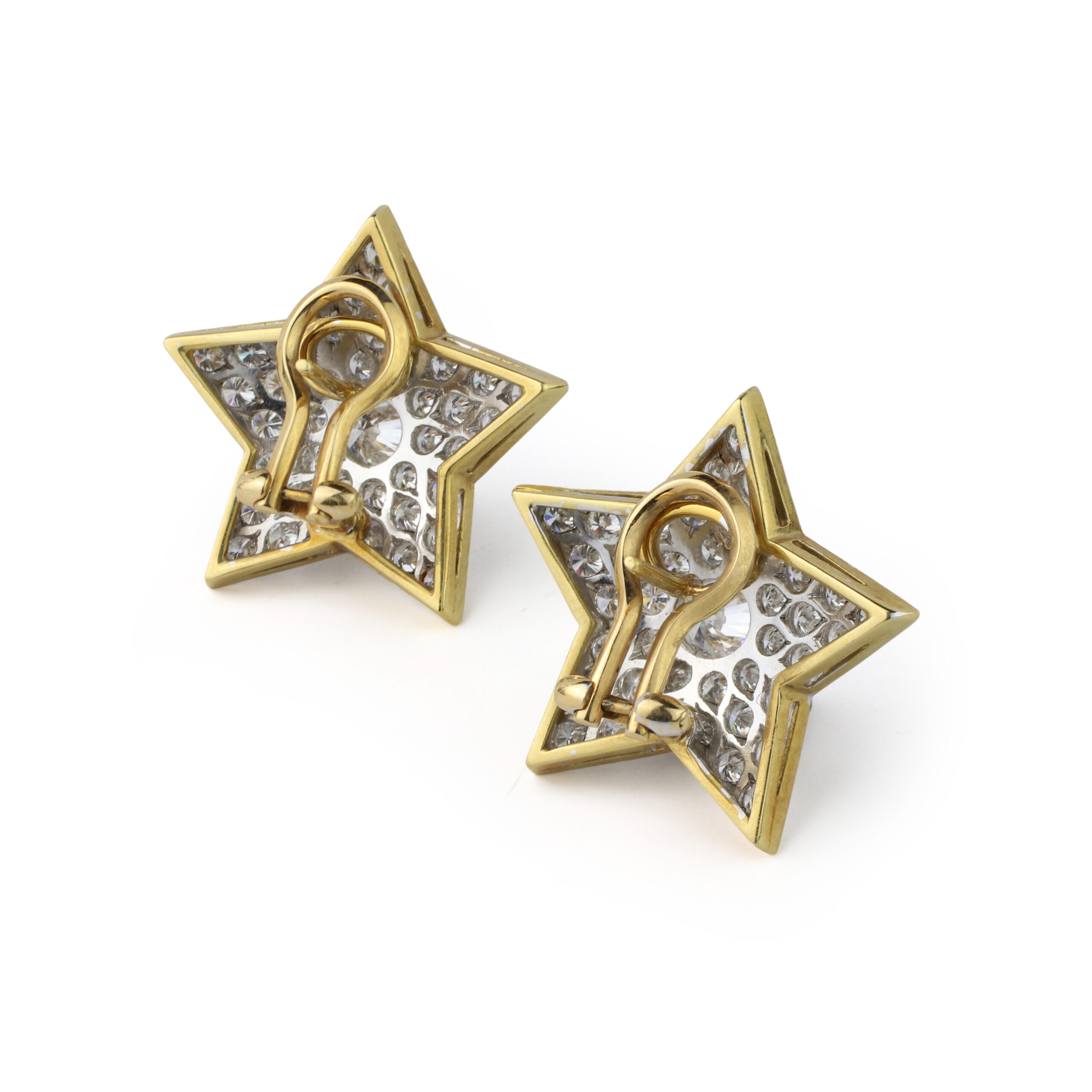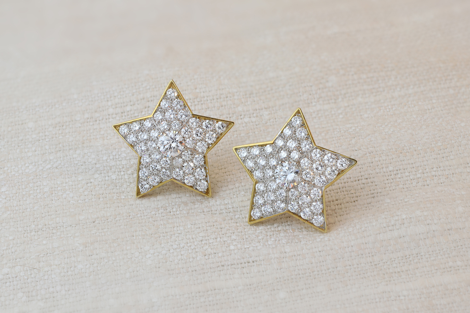 Centering on a larger round diamond within a pave diamond set star shape frame with a yellow gold outline, circa 1990