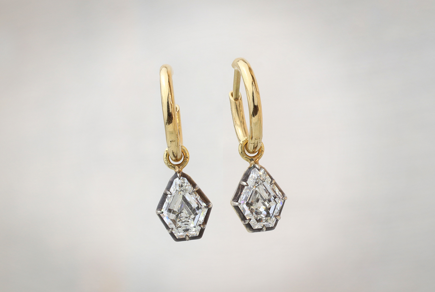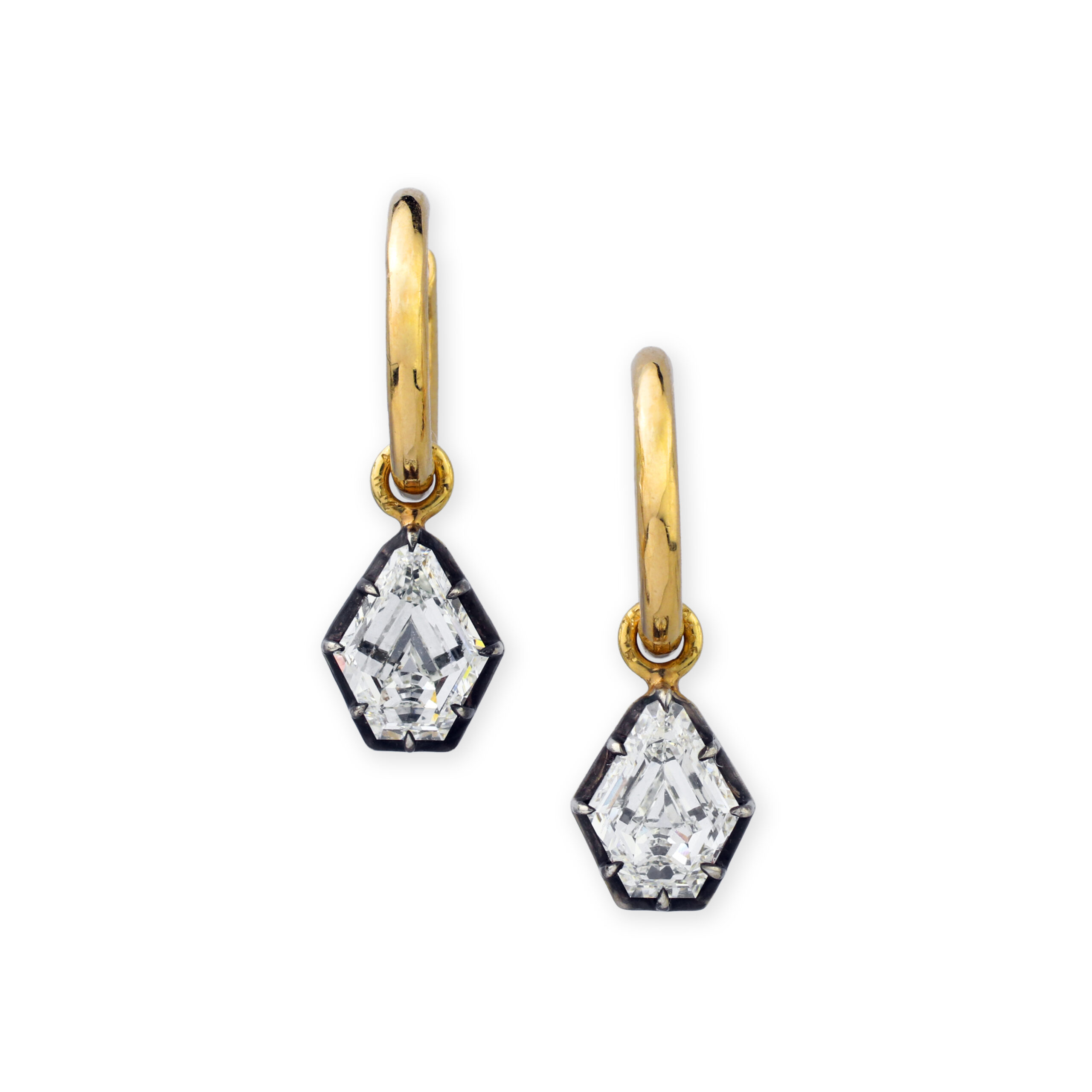 Each designed as a hinged gold hoop suspending a silver and gold collet set trapezoid shaped diamond drop, contemporary