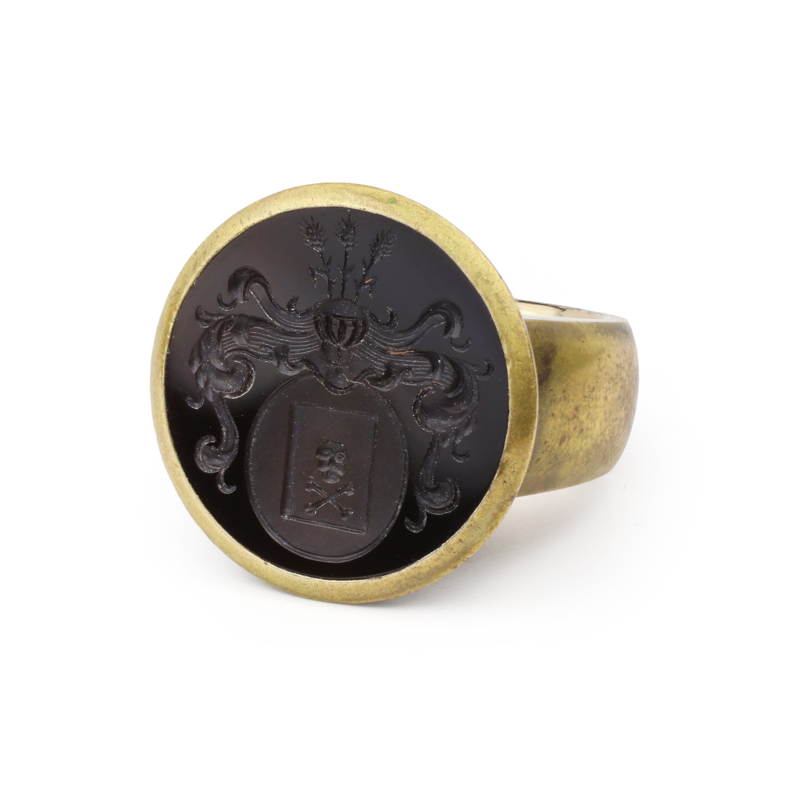 Centering on a circular shaped onyx intaglio carved with a crest including sheaves of wheat, a helmet and a skull and cross bones, bezel set in a sculpted brass and white gold mounting, circa 2010