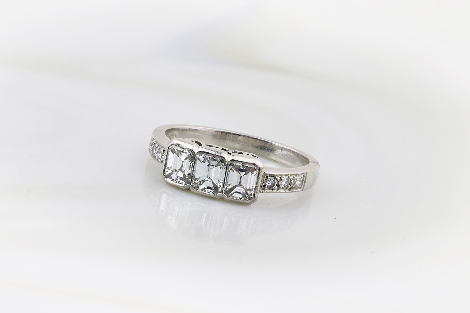 Centering on three bezel set rectangular cut diamonds, to the circular-cut diamond set shoulders, mounted in platinum, circa 1950