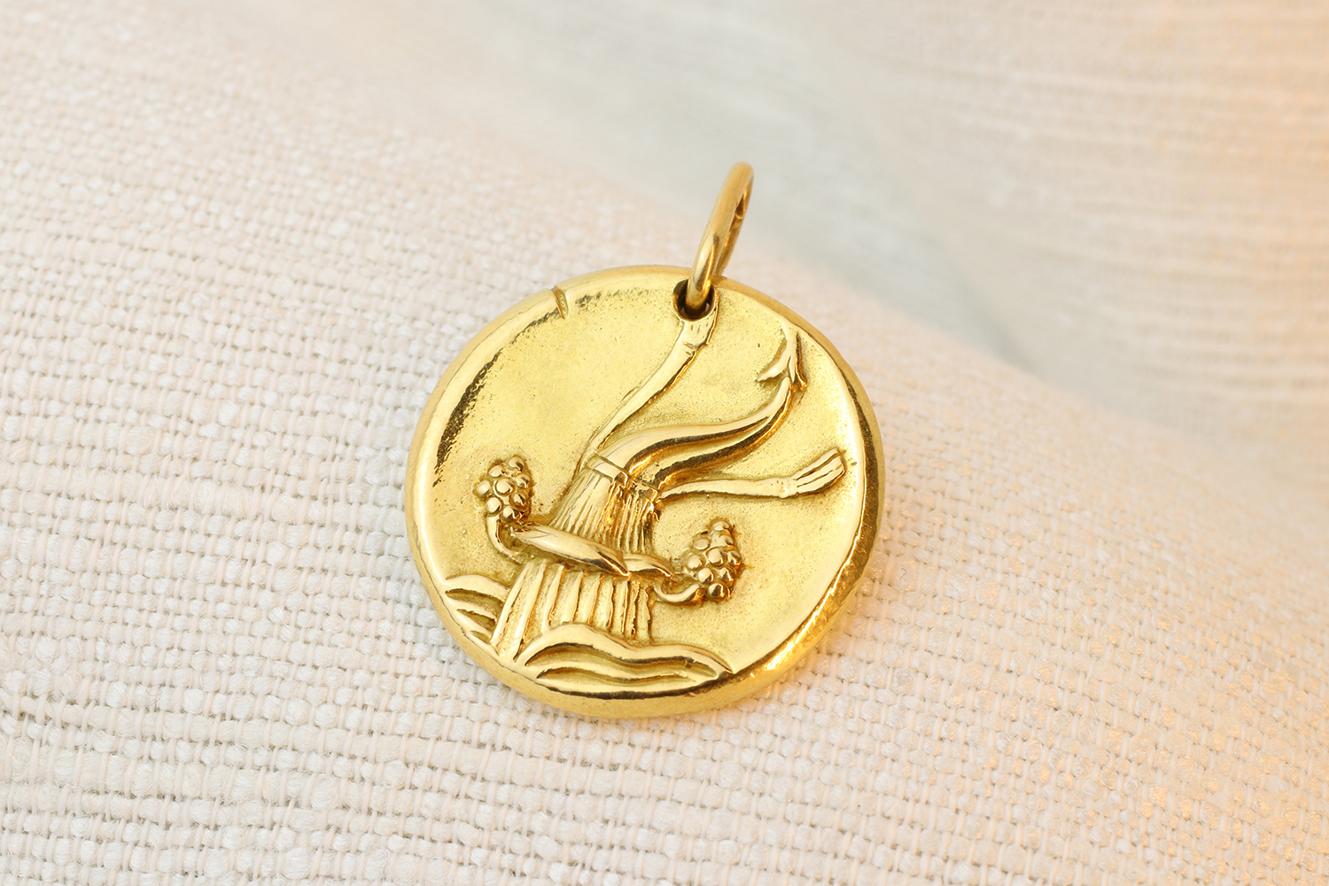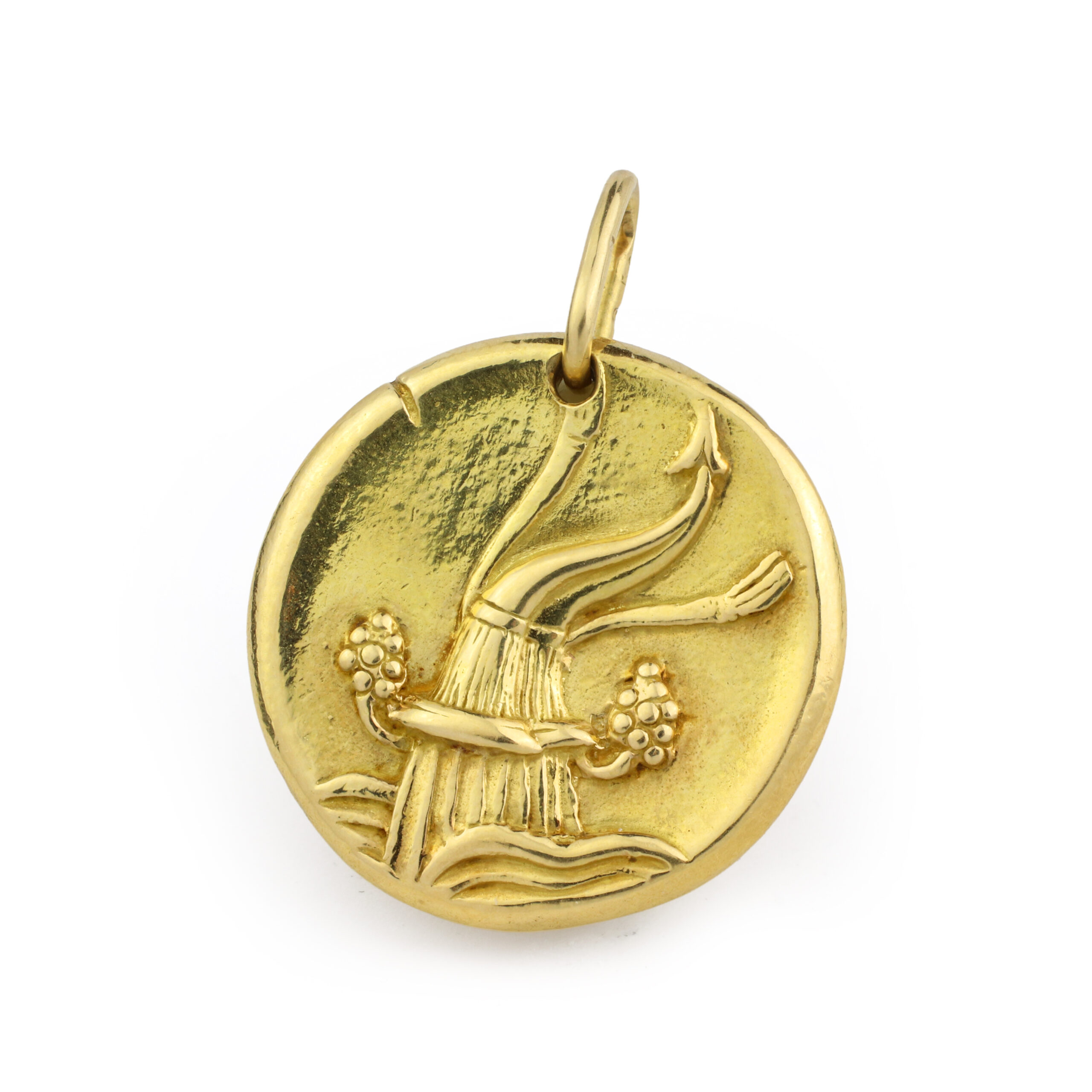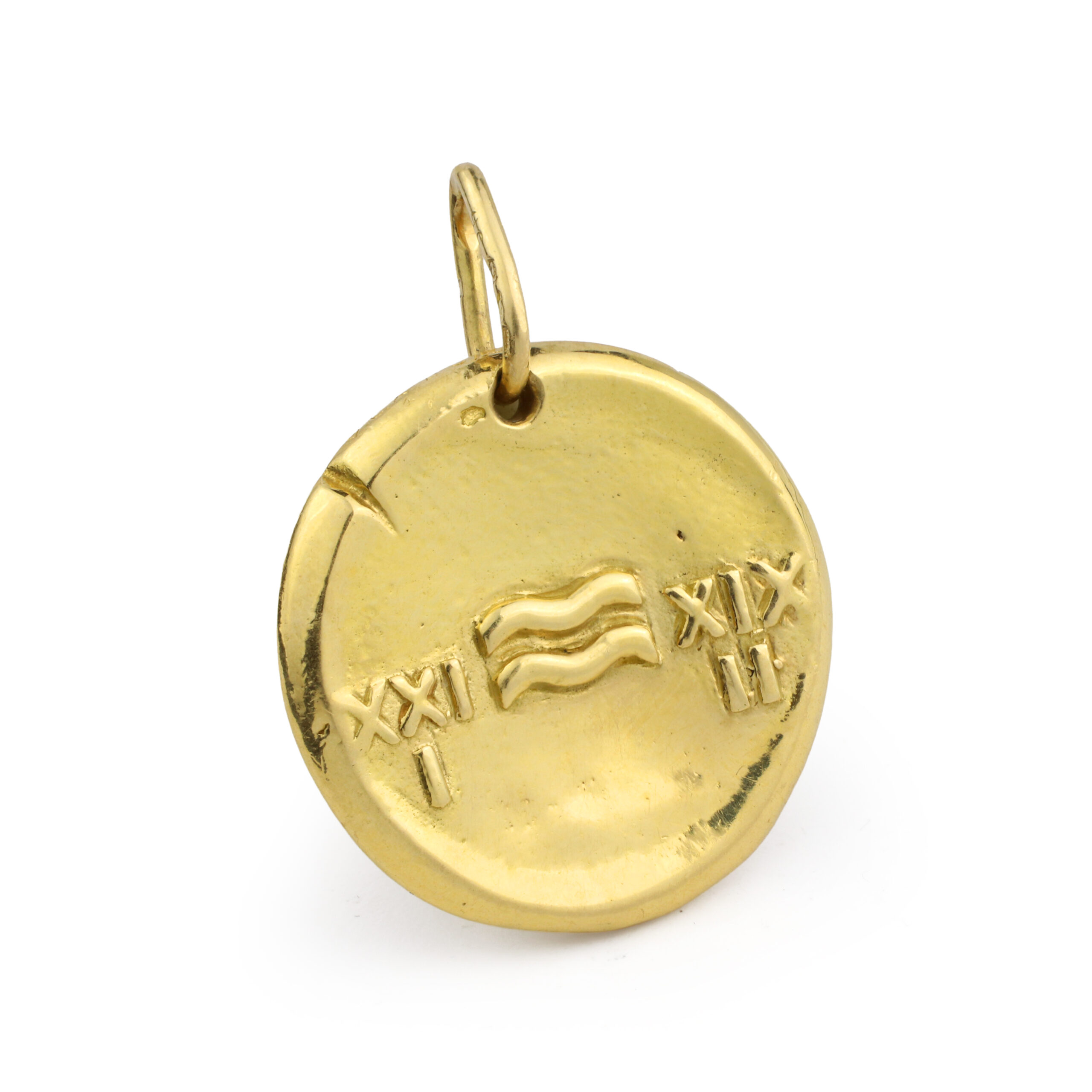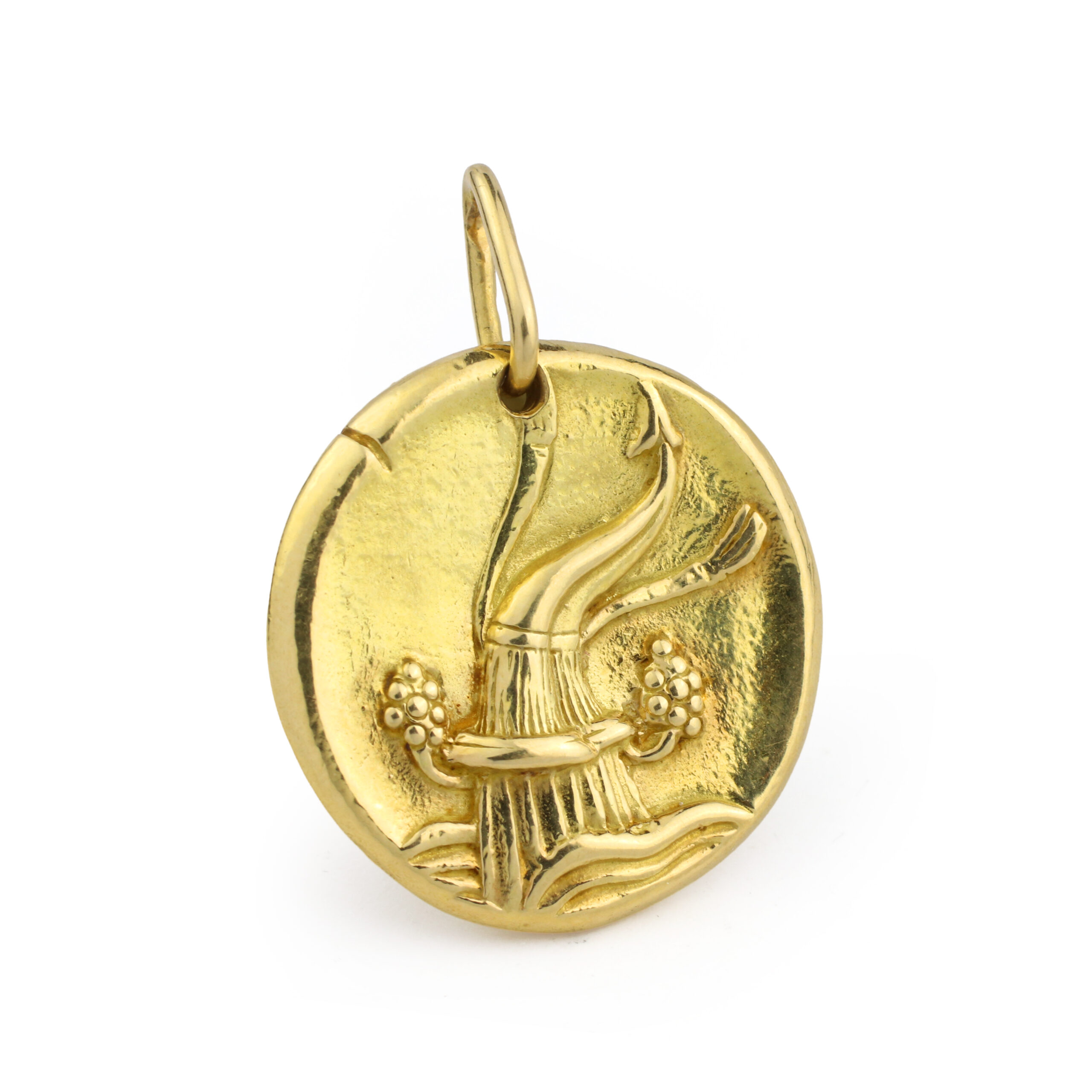 Designed as a round gold pendant featuring an overflowing vessel on the front and sign for Aquarius to the reverse, circa 1960