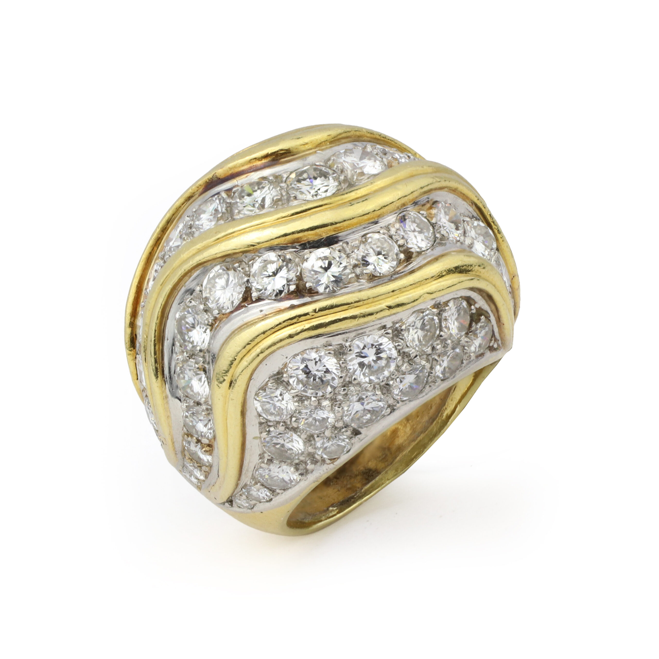 Designed as a domed sculpted gold ring with a wave pattern set with round diamonds, circa 1970